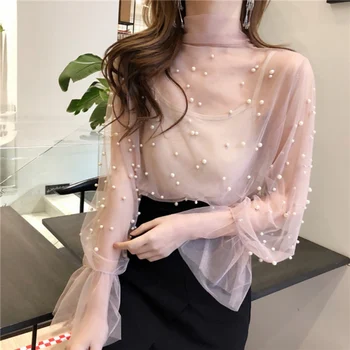 Hot Sales Summer Long Flare Sleeve Bow Tie Mesh Blouses Women 2 pcs Camis+Transparent Sexy Mesh Shirts Women Rivet Pearl Tops