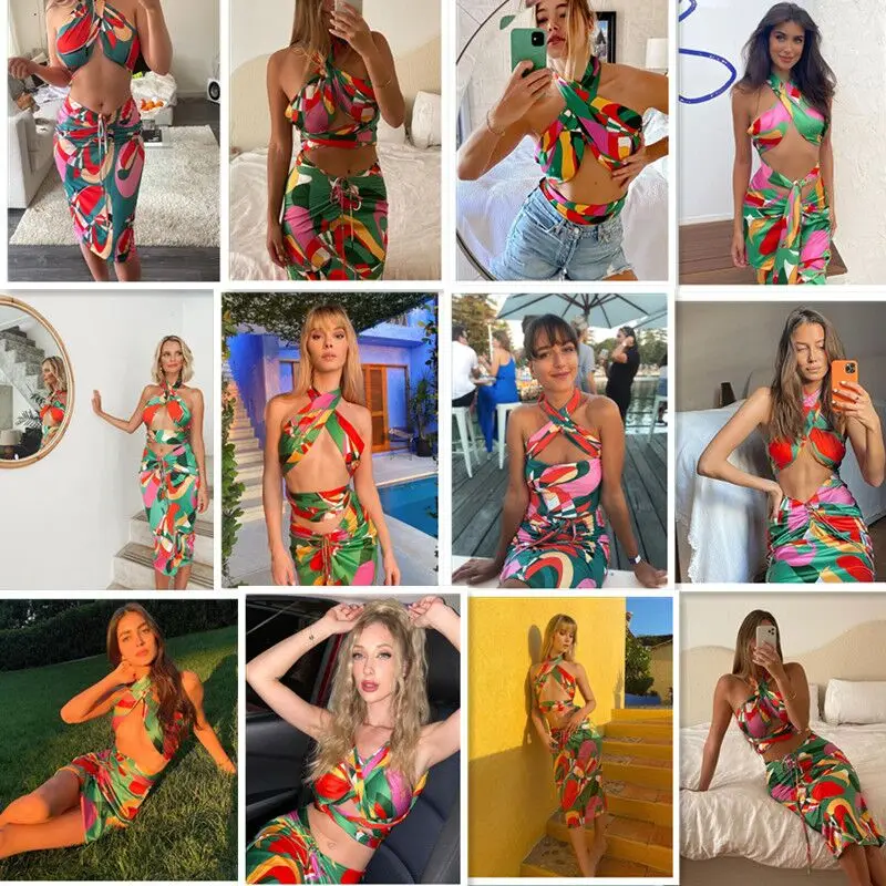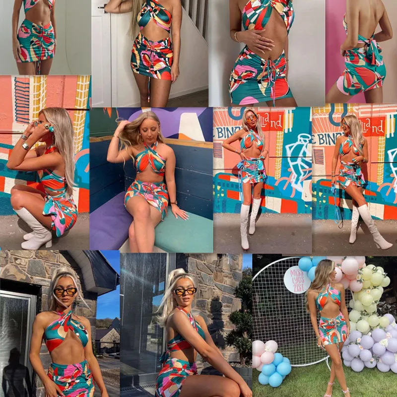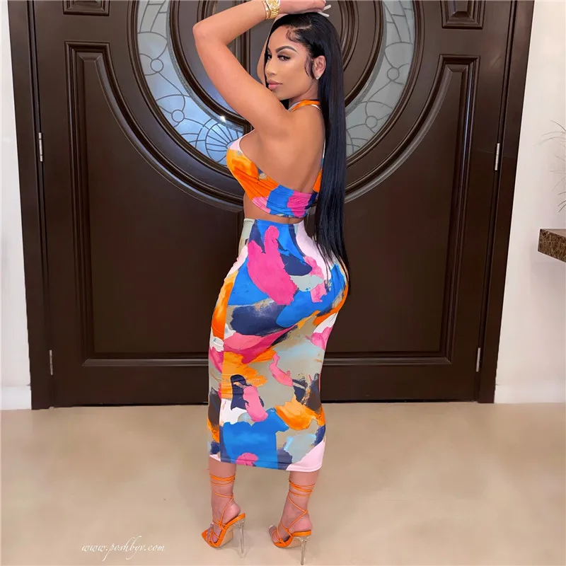 2021 Sexy Print Tracksuit Woman Two Piece Boho Outfit Suits Halter Bandage Tanks And Ruched Drawstring Midi Skirts Matching Sets