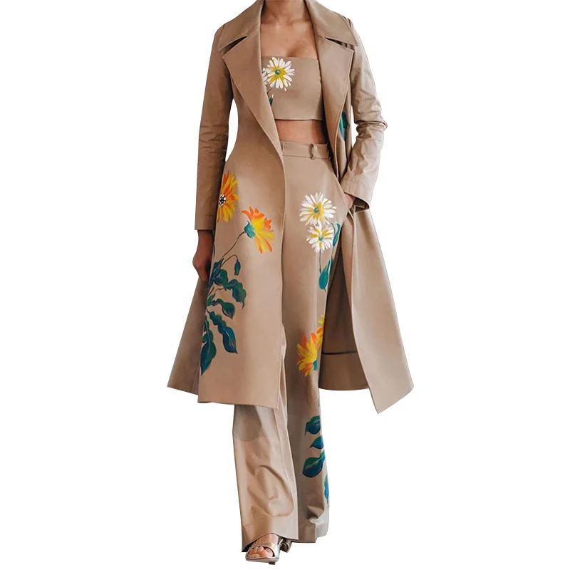 2021 Spring Autumn Women Suit Fashion 3 Pcs Sets Female Printed Long Coat+Tank Top+High Waist Pants Women’s Office Suit Clothes