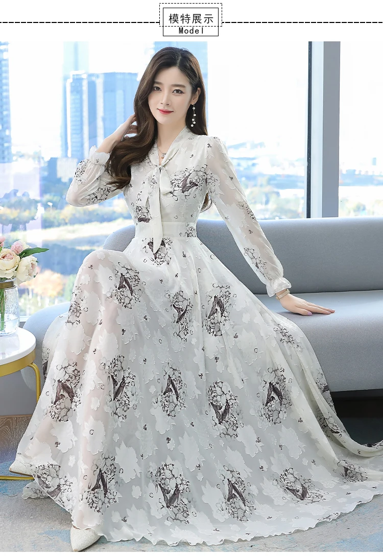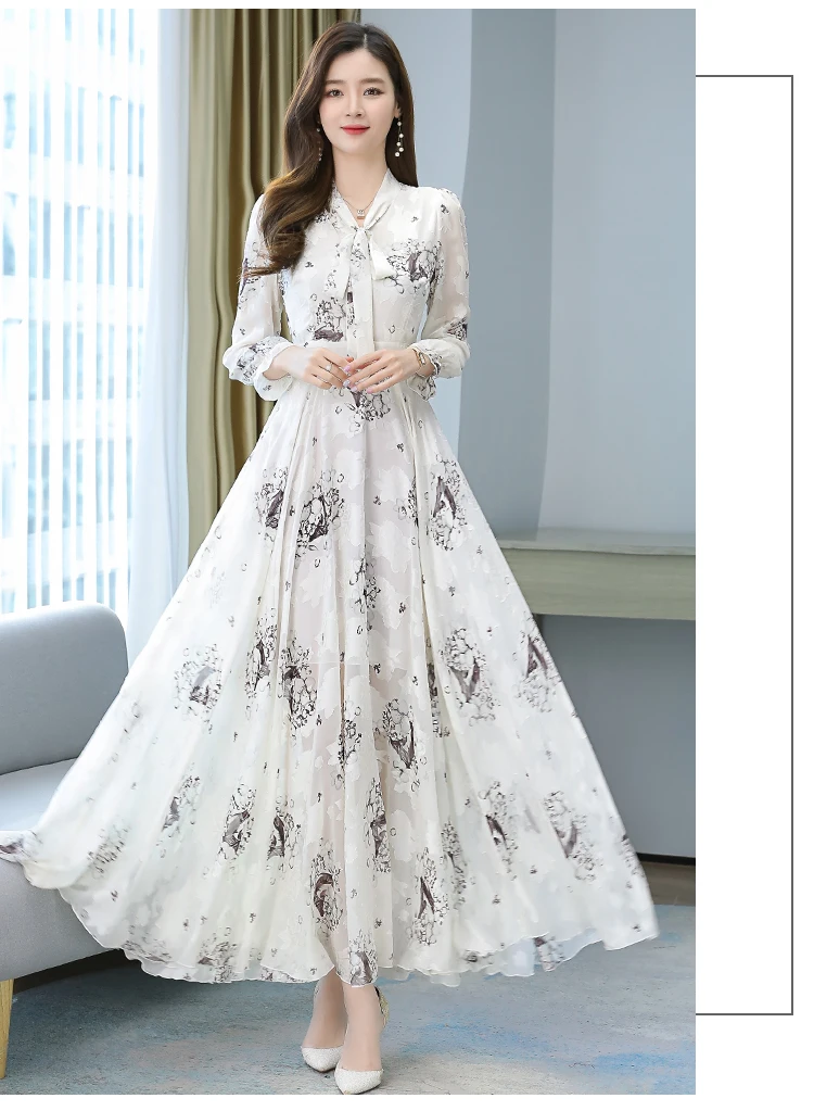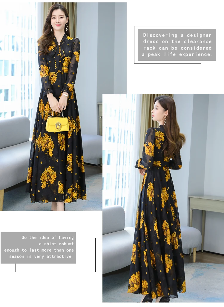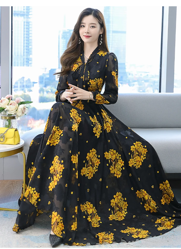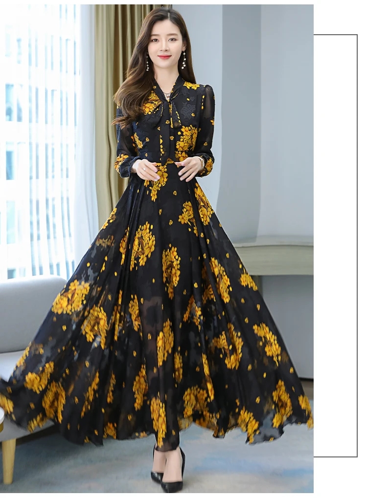 DROWYD 2021 Summer New Arrival 2021 Summer Black Print Maxi Dress New Arrival High Quality Plus Size S-4XL Flower Long Sleeve Women Chiffon Long Dress Vestidos