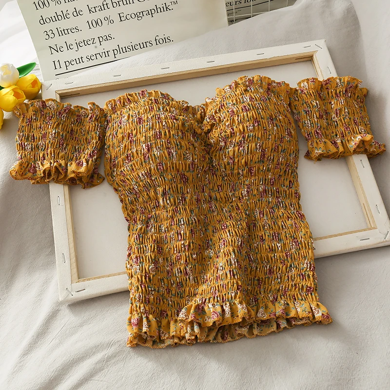 6 Colors Print Stretchy Flower Shirt Summer Sweet Ruffles Slash Neck Cropped Blouses With Pads Women Padding Crop Tops For Girls