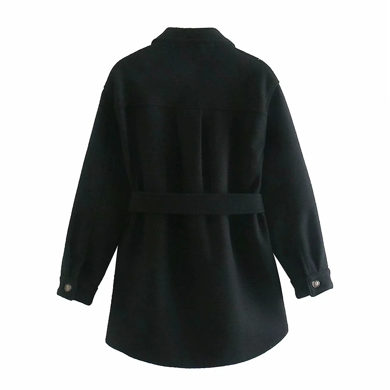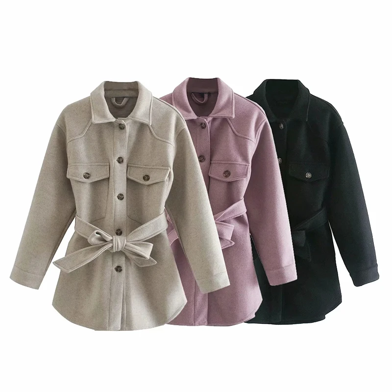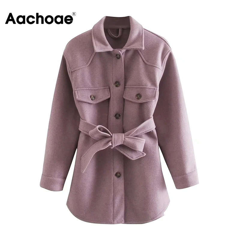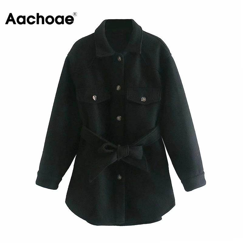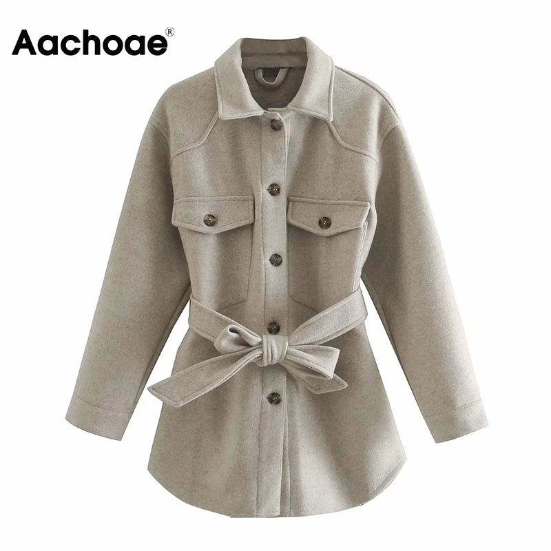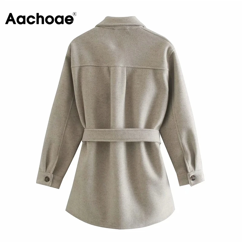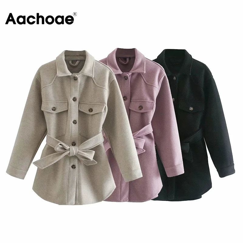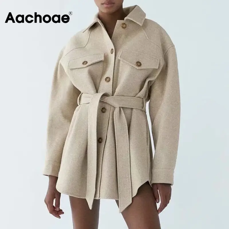 Aachoae Autumn Winter Women Chic Wool Coats With Belt 2021 Solid Long Sleeve Pockets Outerwear Turn Down Collar Elegant Coat