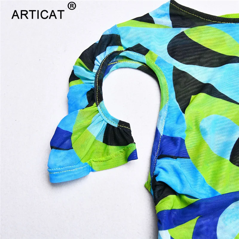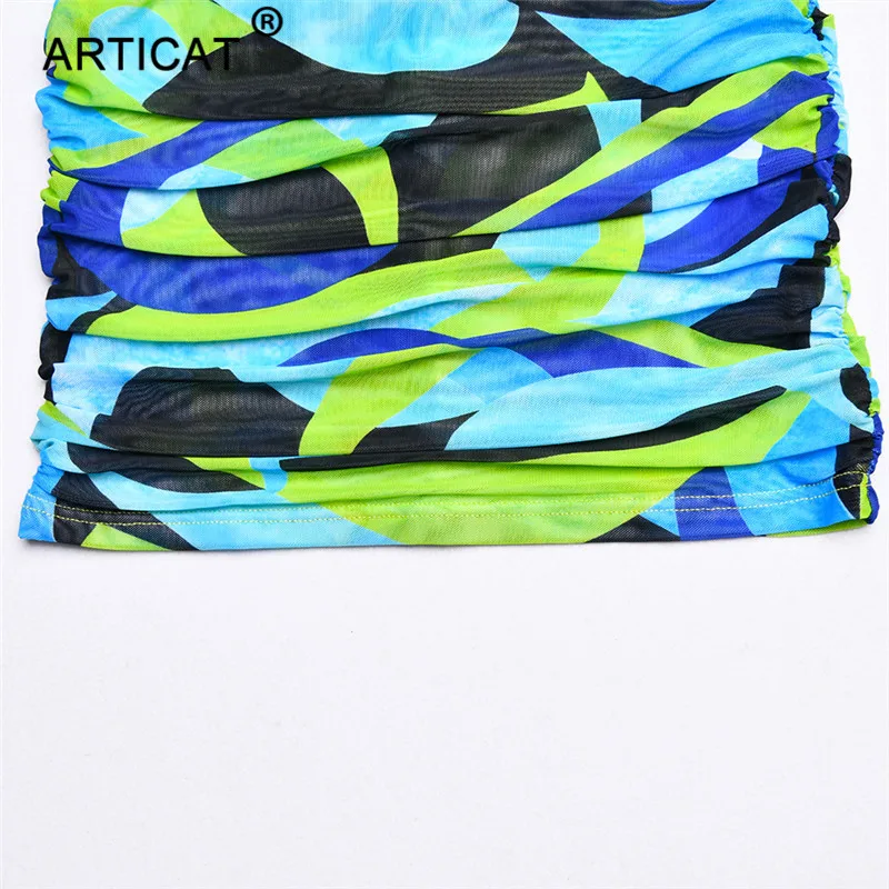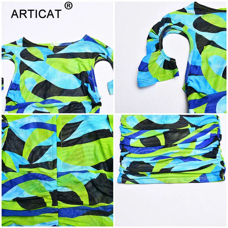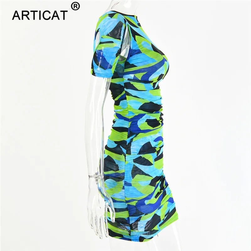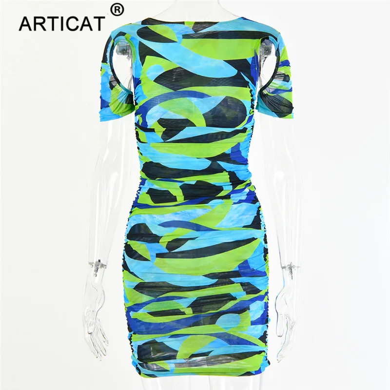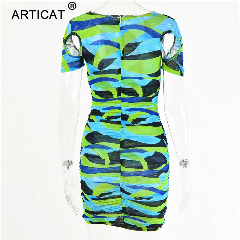 Articat Print Hollow Out Ruched Dress For Women O Neck Short Sleeve Bodycon Mini Dress Ladies Streetwear Elegant Party Vestidos