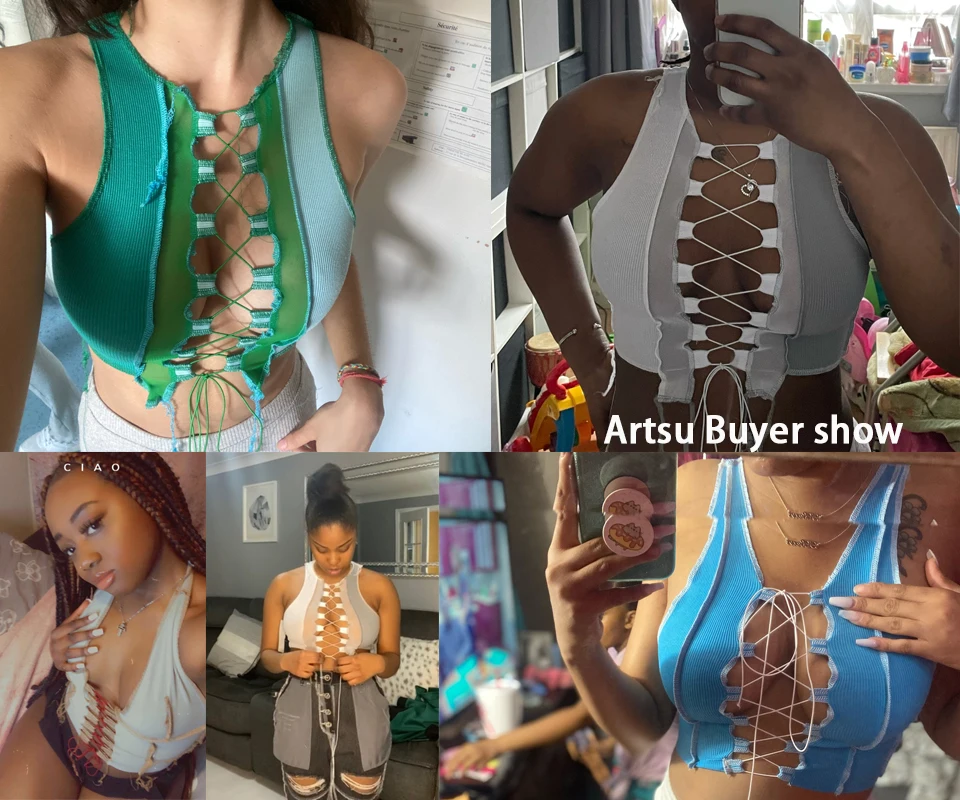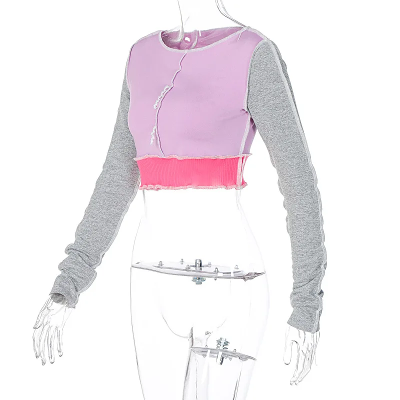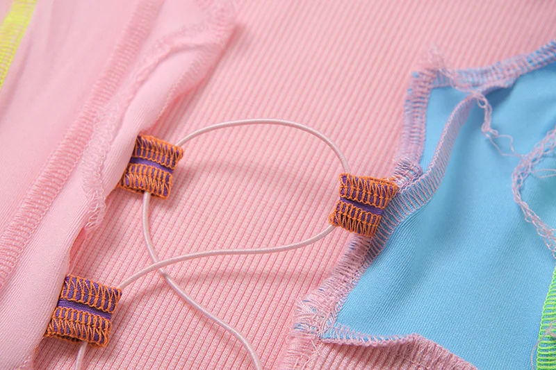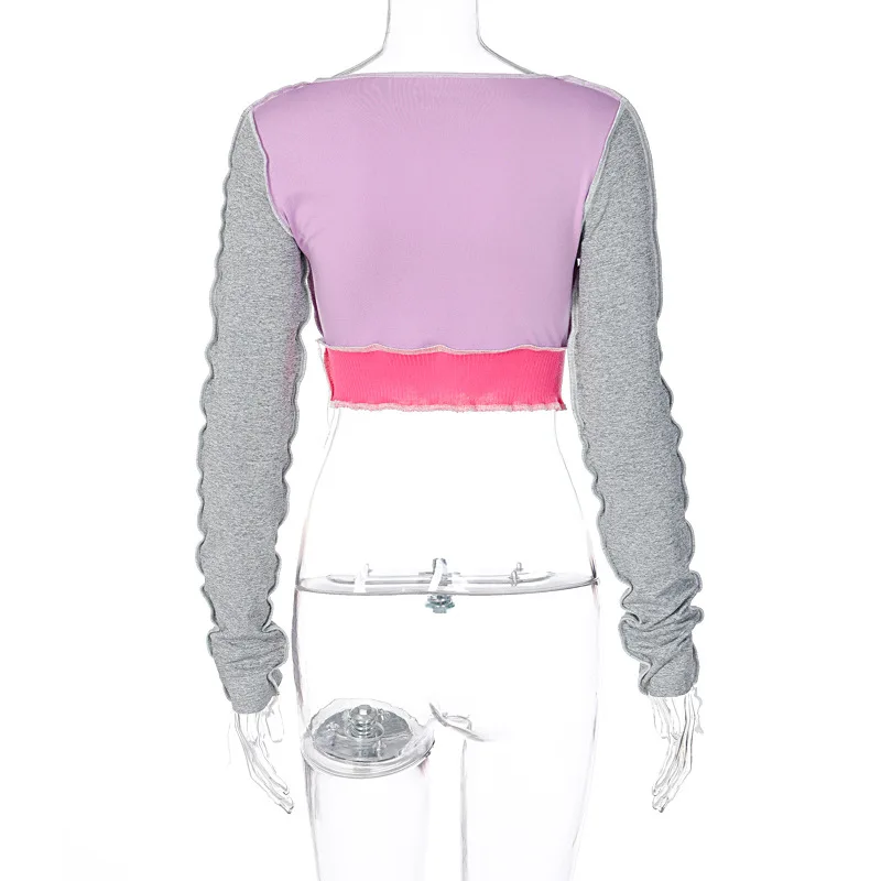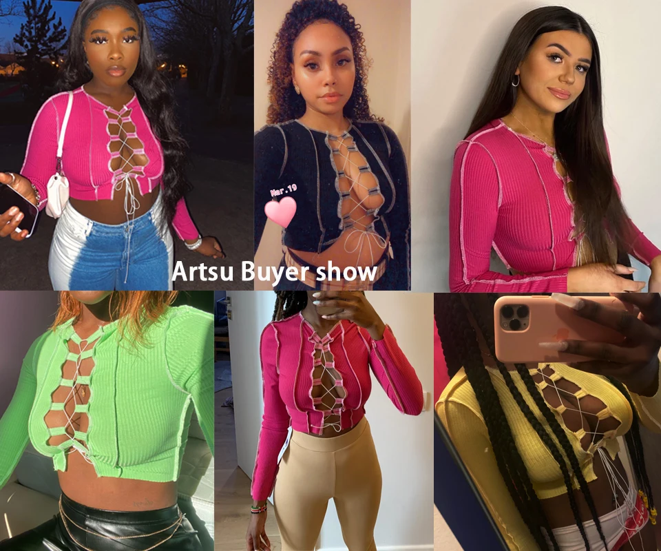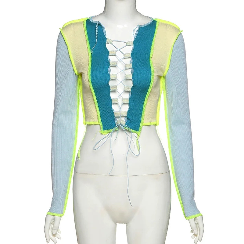 Artsu 8 Colors Sexy Hollow Out Women Long Sleeve Crop Tops Striped Patchwork Drawstring Ribbed Bandage Fitness Clothes AS41186