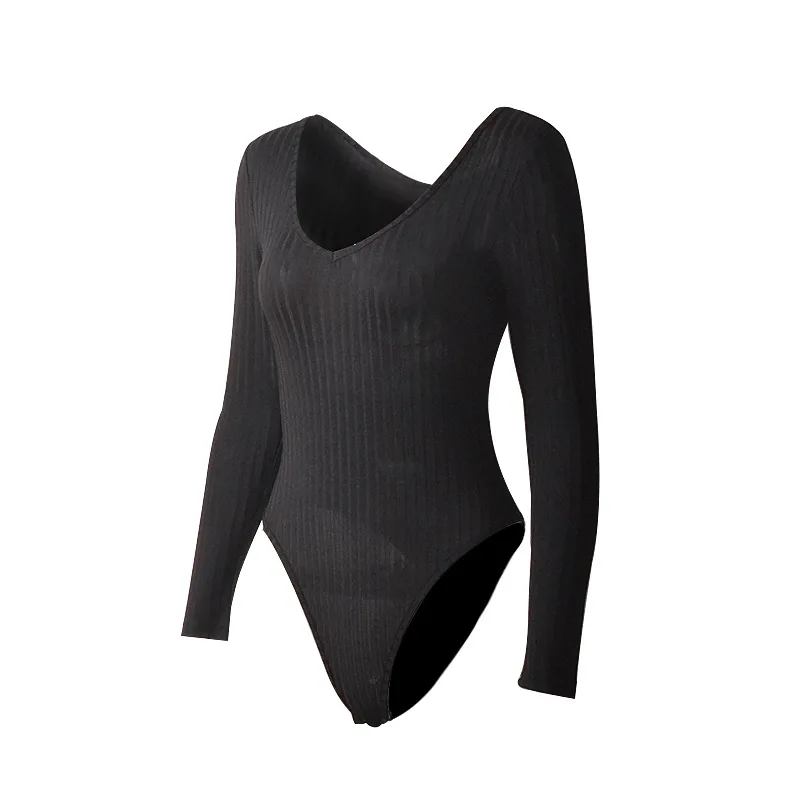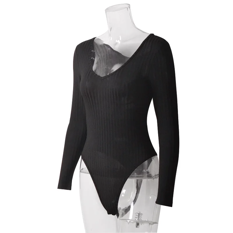Autumn Ribbed Knitted Sexy Low Cut Bodysuit Women Black White Red V Neck Female Long Sleeve Jumpsuit Office Lady Slim Top Winter