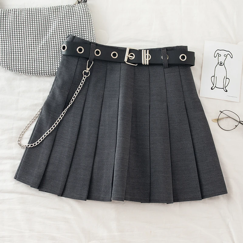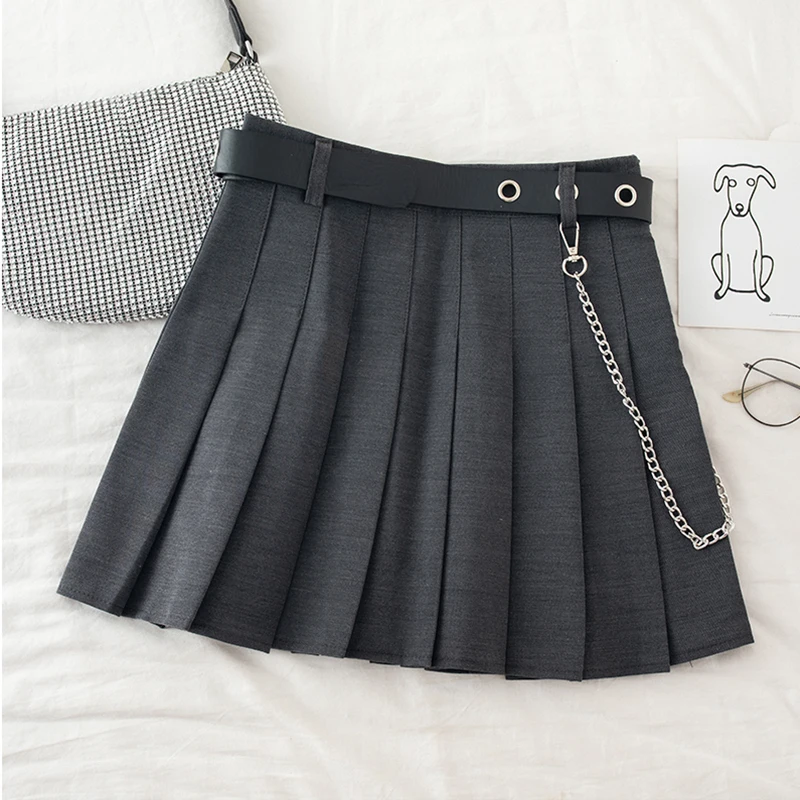 Pleated mini skirt comes with black chain-belt. high waistline and safety-shorts.