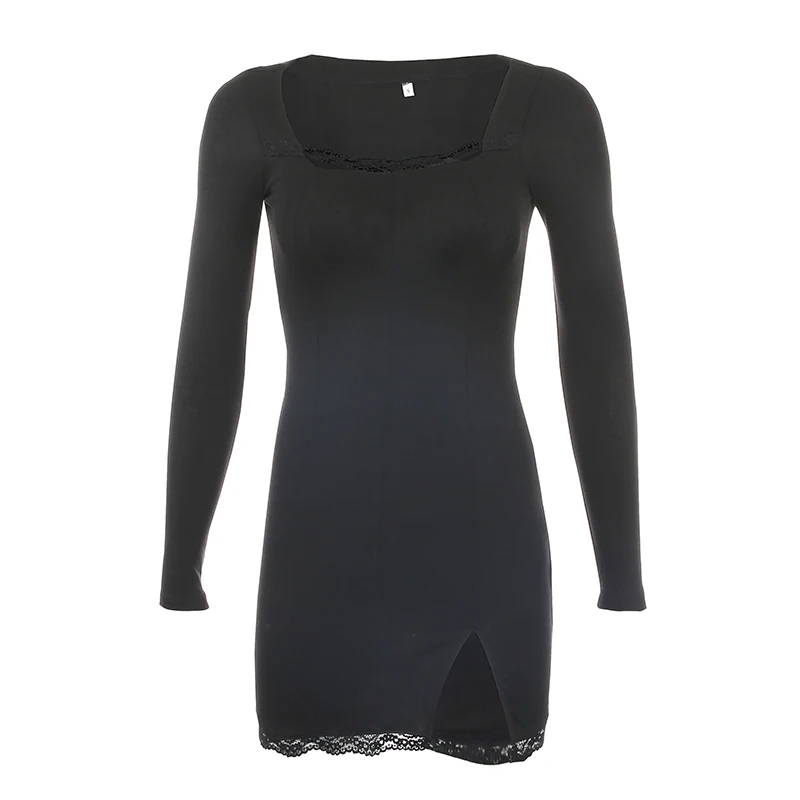 Darlingaga Square Neck Lace Patchwork Bodycon Black Dress Women Elegant Cotton Fashion Side Split Autumn Dress Mini Ladies Basic