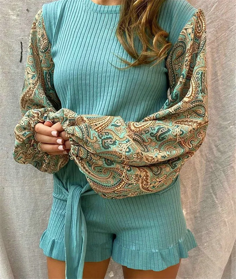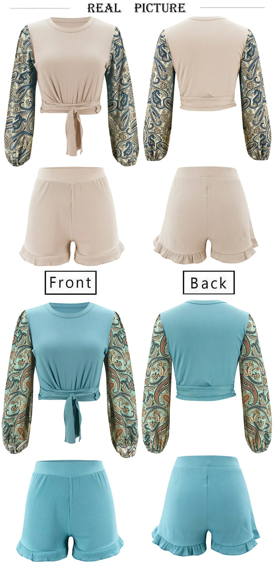 Fashion Women 2 Piece Outfits Patchwork Design Belt Ruffles Decor O-Neck Long Lantern Sleeve Print TOP+Elastic High Waist Shorts