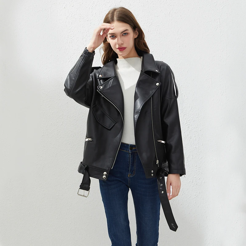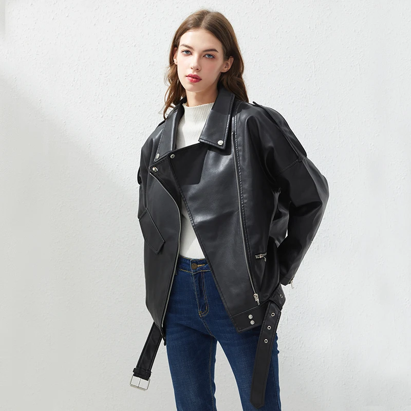 Fitaylor PU Faux Leather Jacket Women Loose Sashes Casual Biker Jackets Outwear Female Tops BF Style Black Leather Jacket Coat