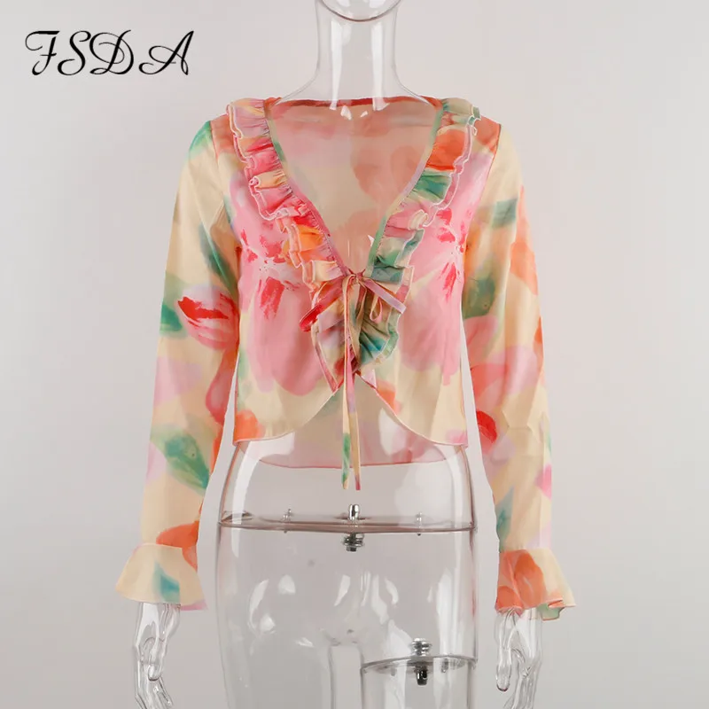 FSDA 2021 V Neck Y2K Print Long Sleeve Crop Top Women Ruffles Summer Spring Casual Bandage Beach Sexy T Shirts