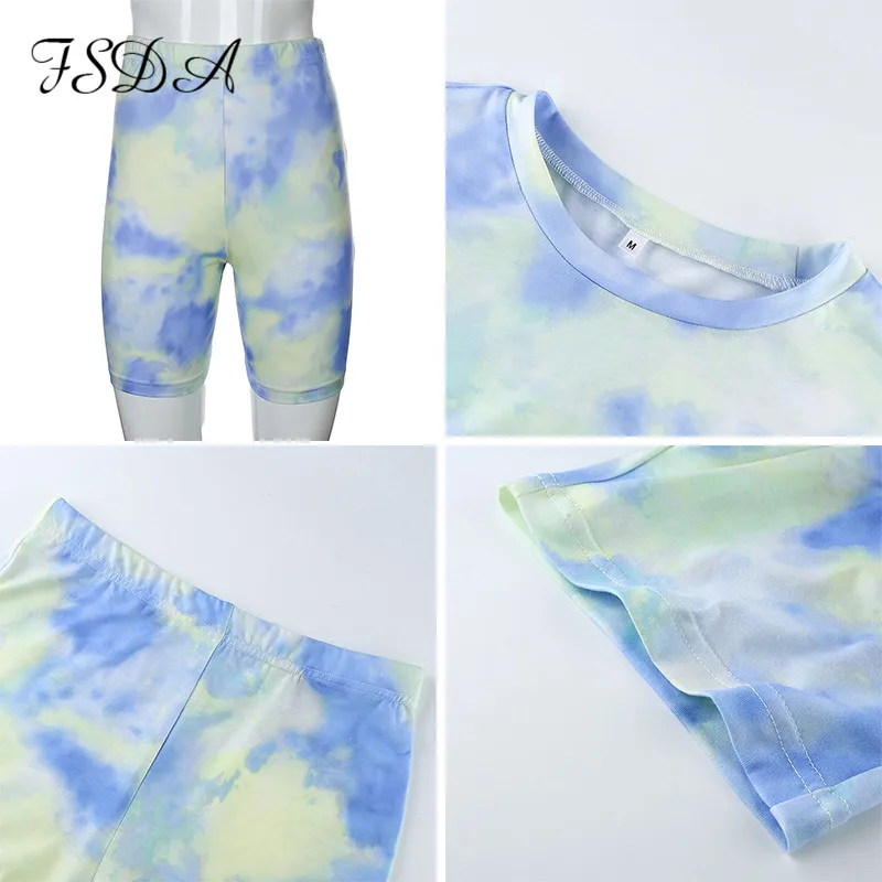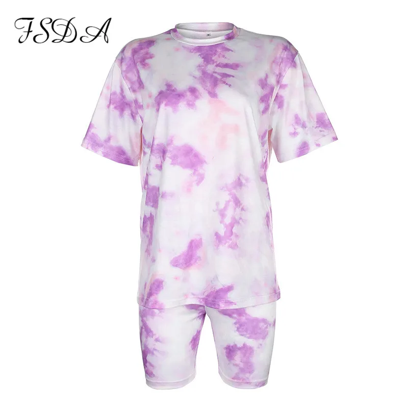 FSDA Women Set Summer Tie Dye Short Sleeve Top Shirt Loose And Biker Shorts Casual Two Piece Set Streetwear Outfits Tracksuits