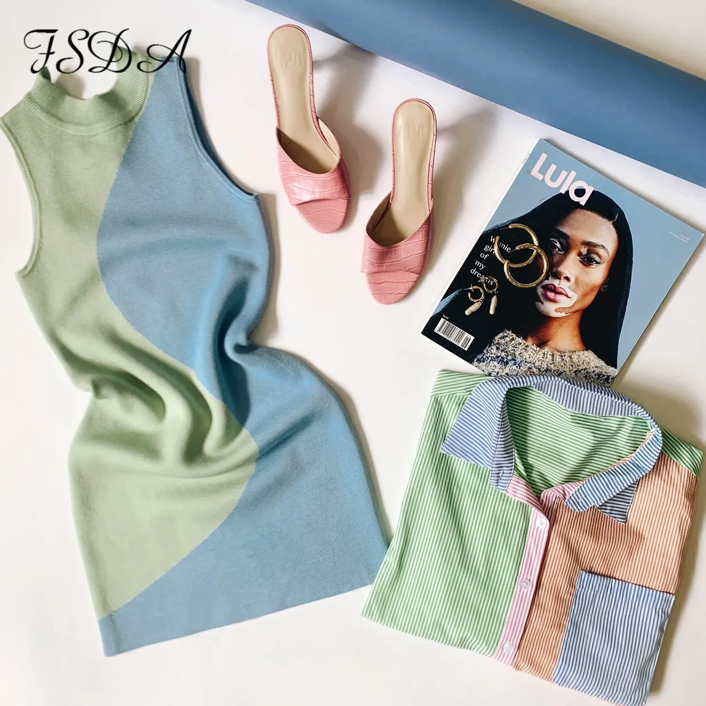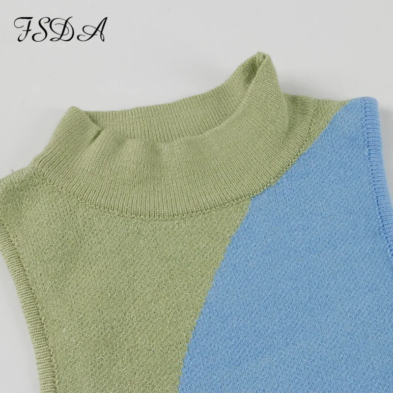FSDA Y2K Knit Bodycon Dress Women Sleeveless 2021 Summer Beach Turtleneck Print Patchwork Sexy Party Mini Dresses 90S Holiday