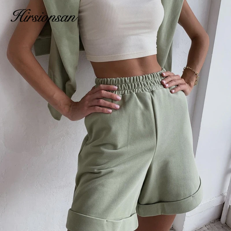 Hirsionsan Summer Cotton Sets Women Casual Two Pieces Short Sleeve T Shirts and High Waist Short Pants Solid Outfits Tracksuit