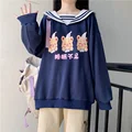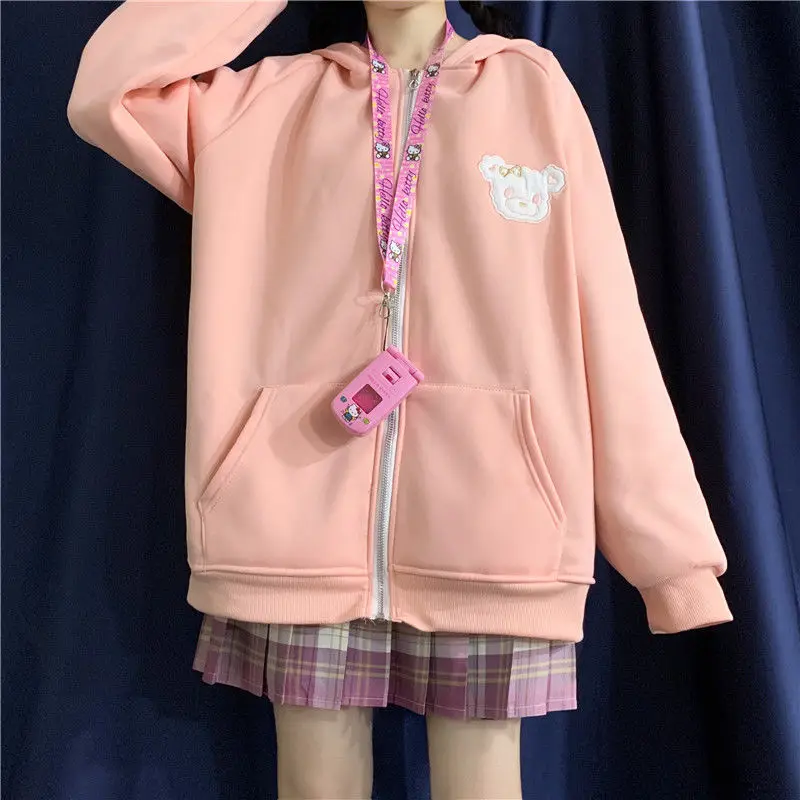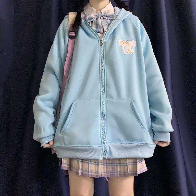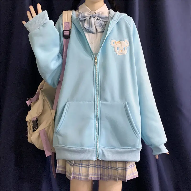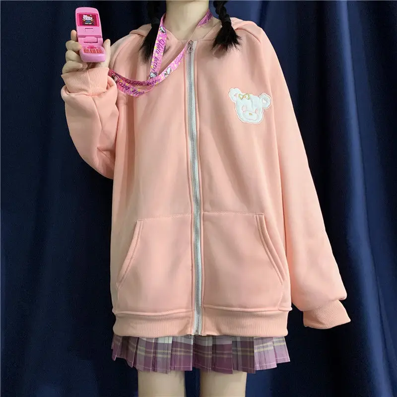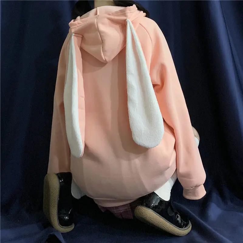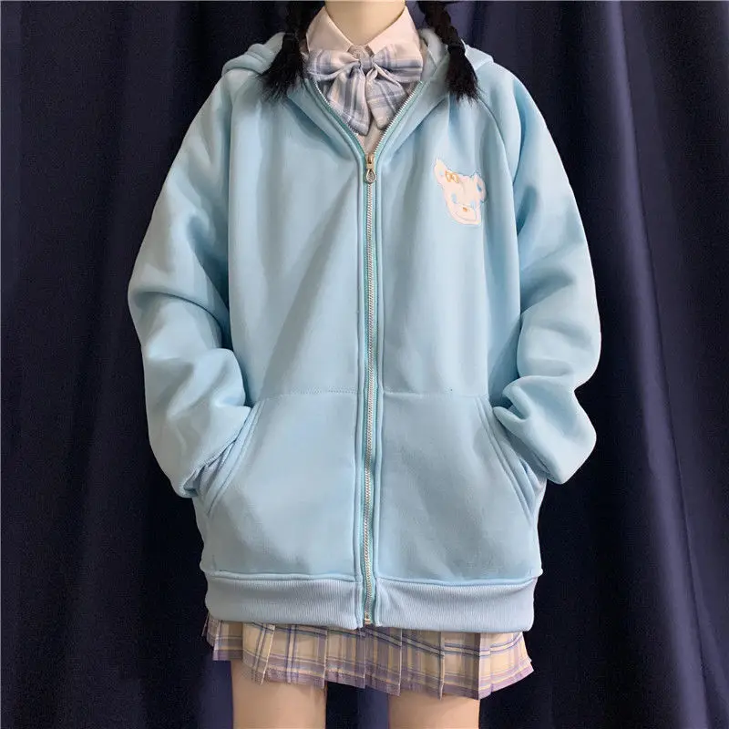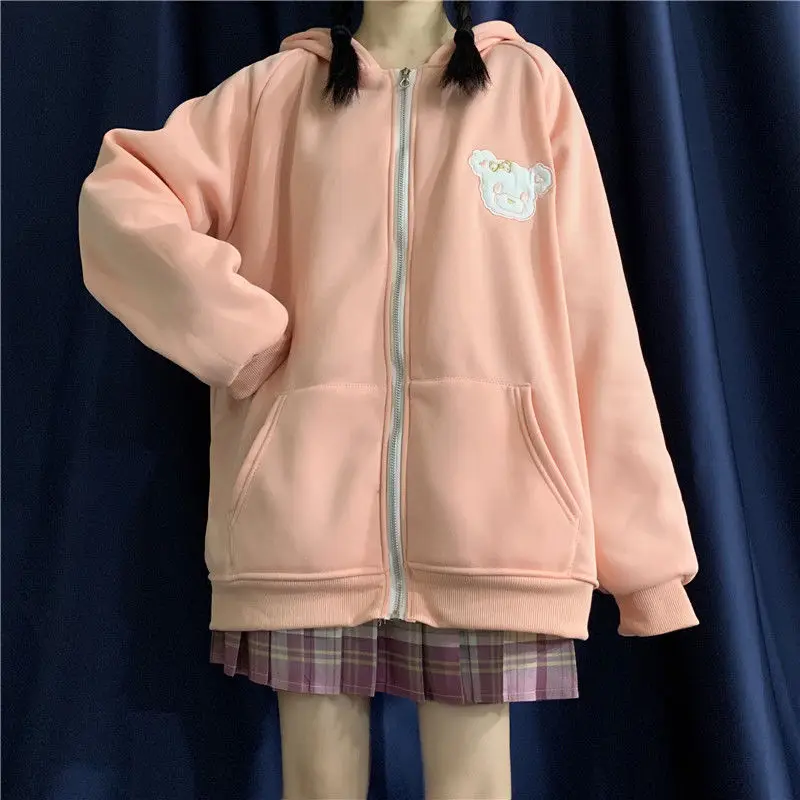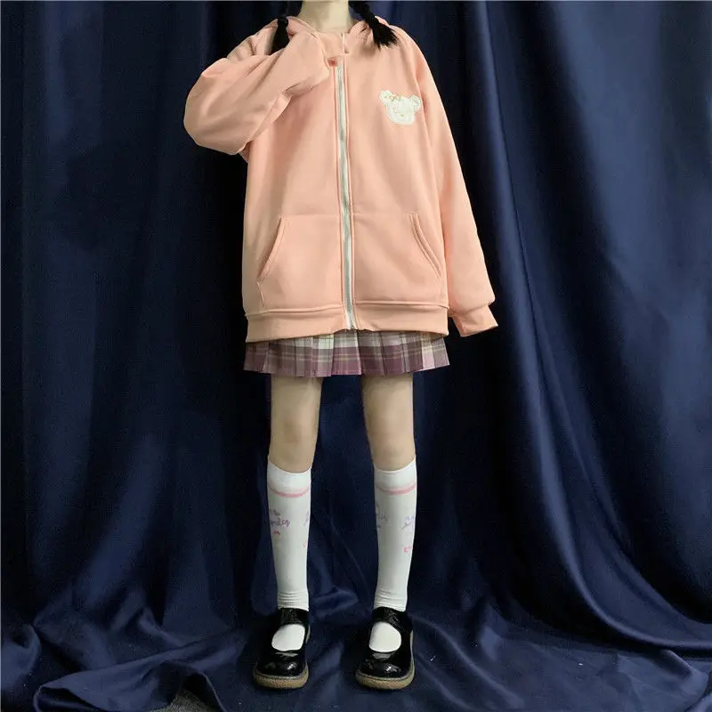 HOUZHOU Korean Style Women Hoodies Spring 2020 Fashion Kawaii Rabbit Ears Sweatshirt Long Sleeve Loose Embroidery Zip Up Hoodie