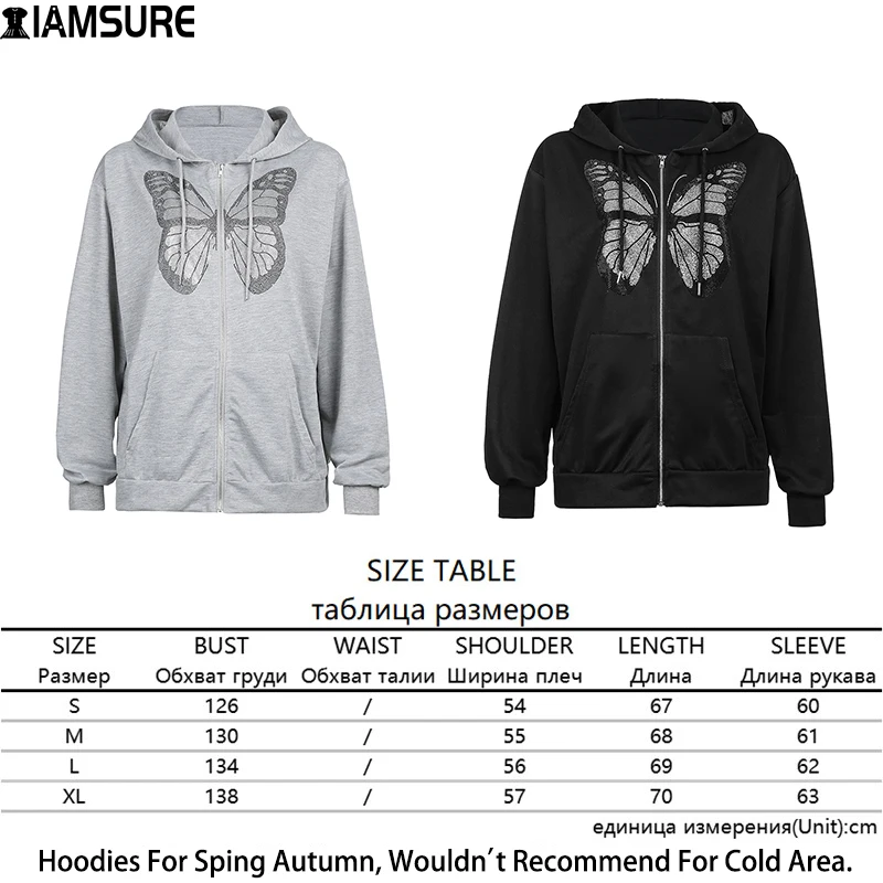 IAMSURE Butterfly Pattern Zipper Up Casual Loose 90s Hoodies Autumn y2k Fashion Long Sleeve Grey Oversize Sweatshirts For Women