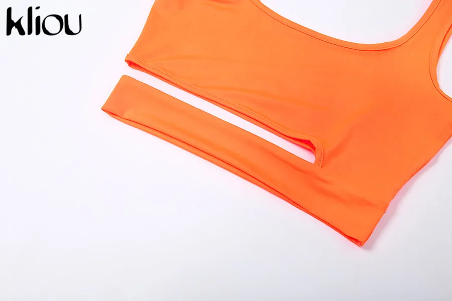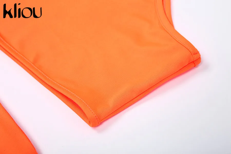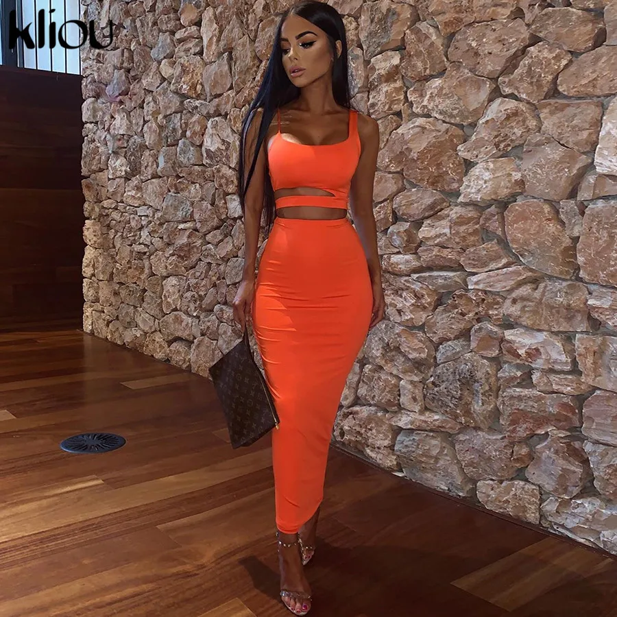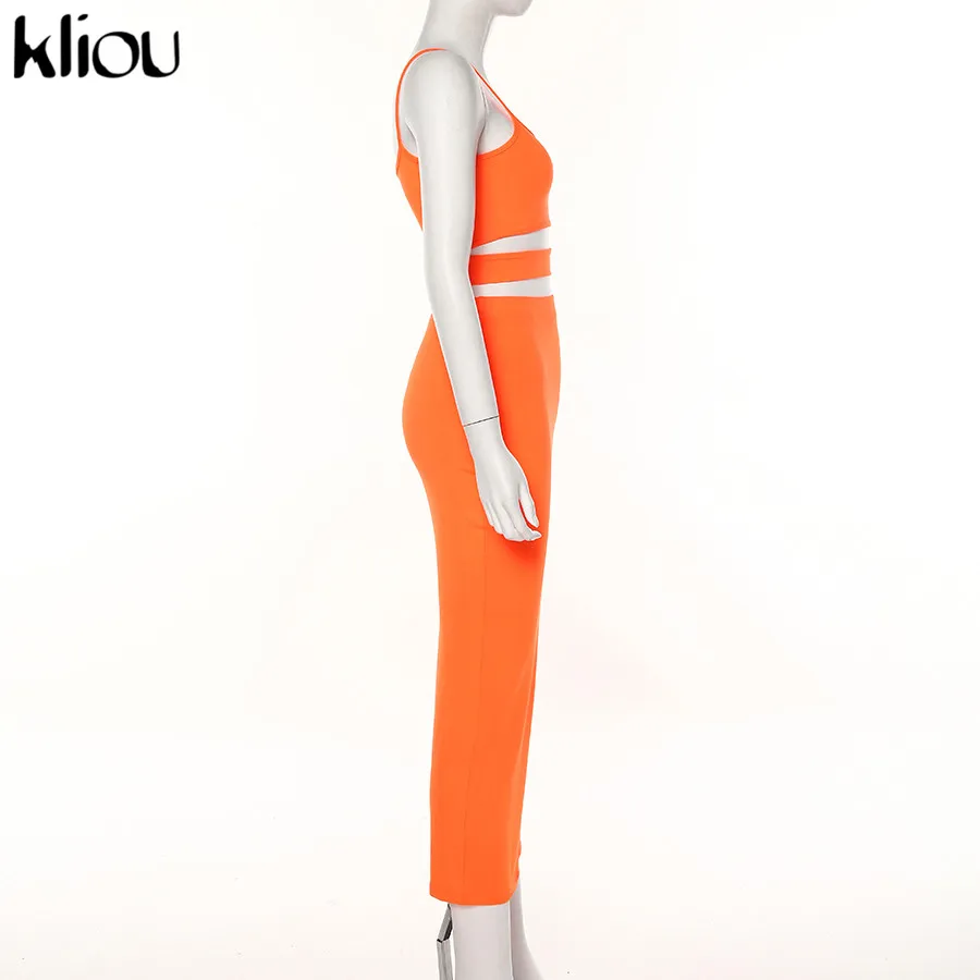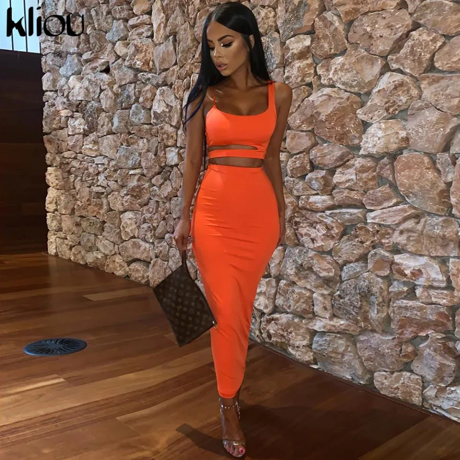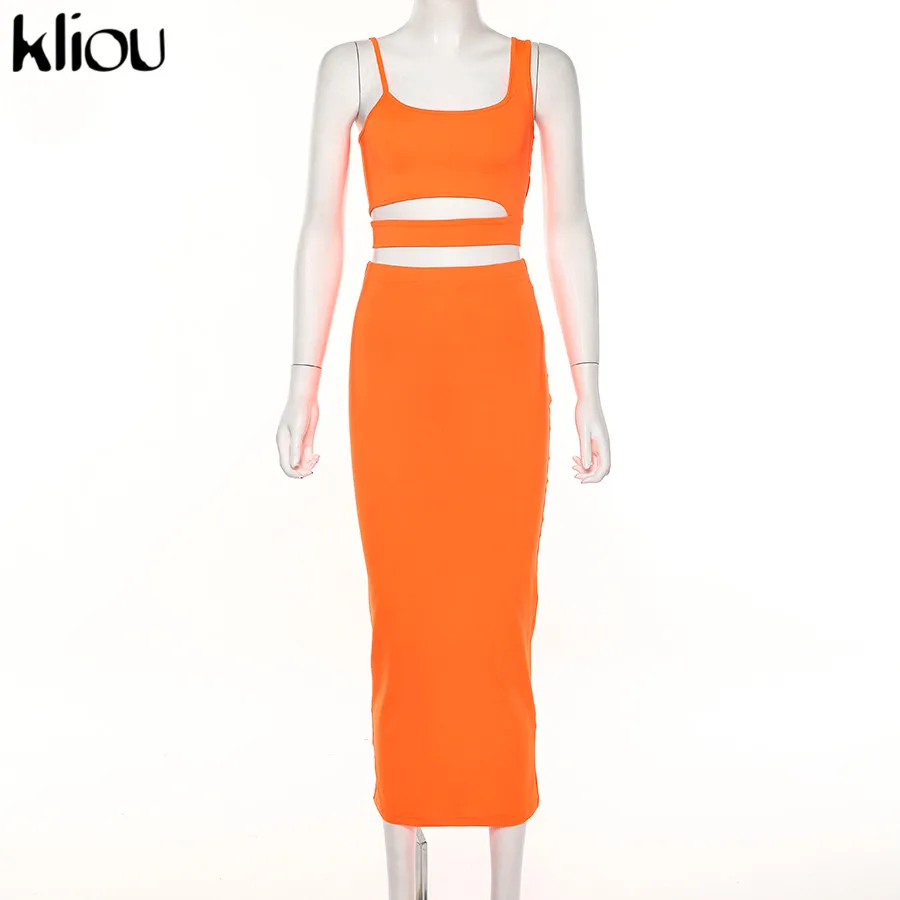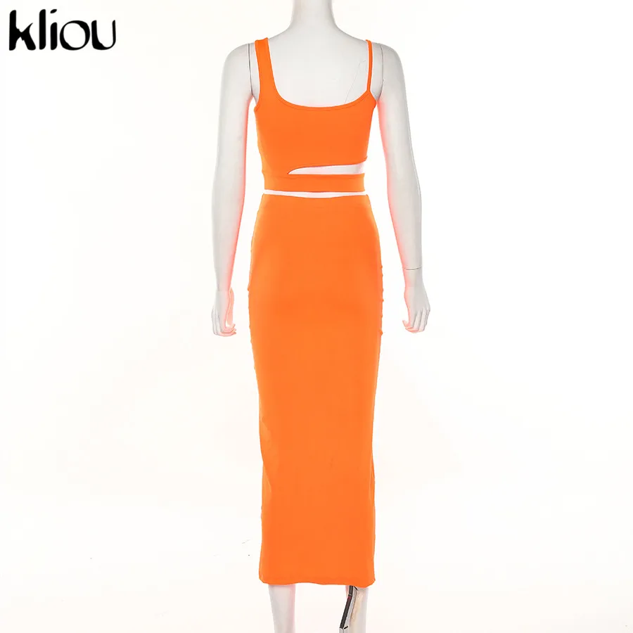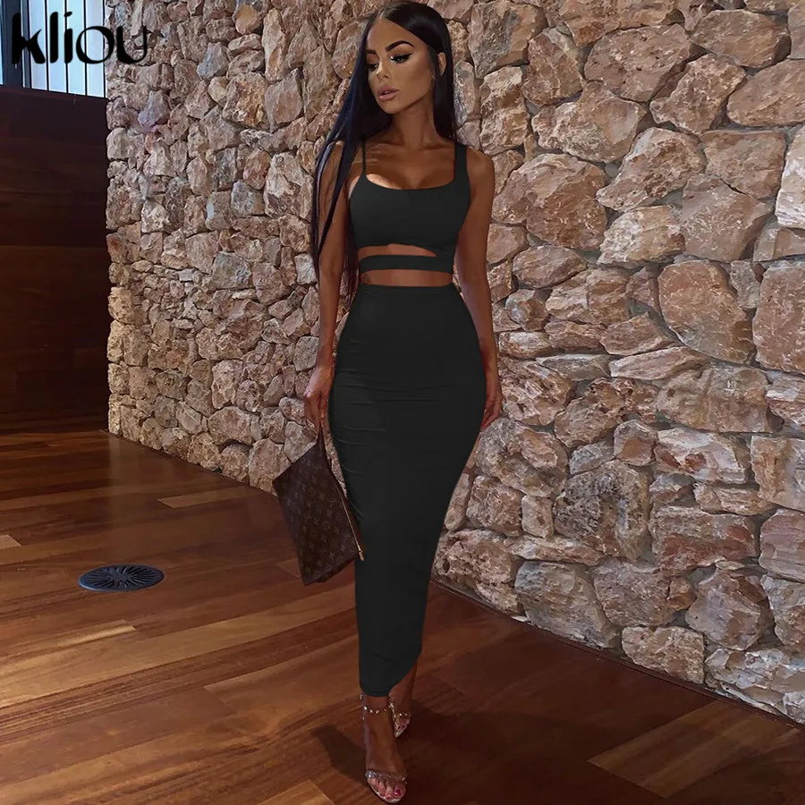 Kliou women solid color strapless hollow out crop top high waist elastic skinny long skirts two pieces set female fashion outfit