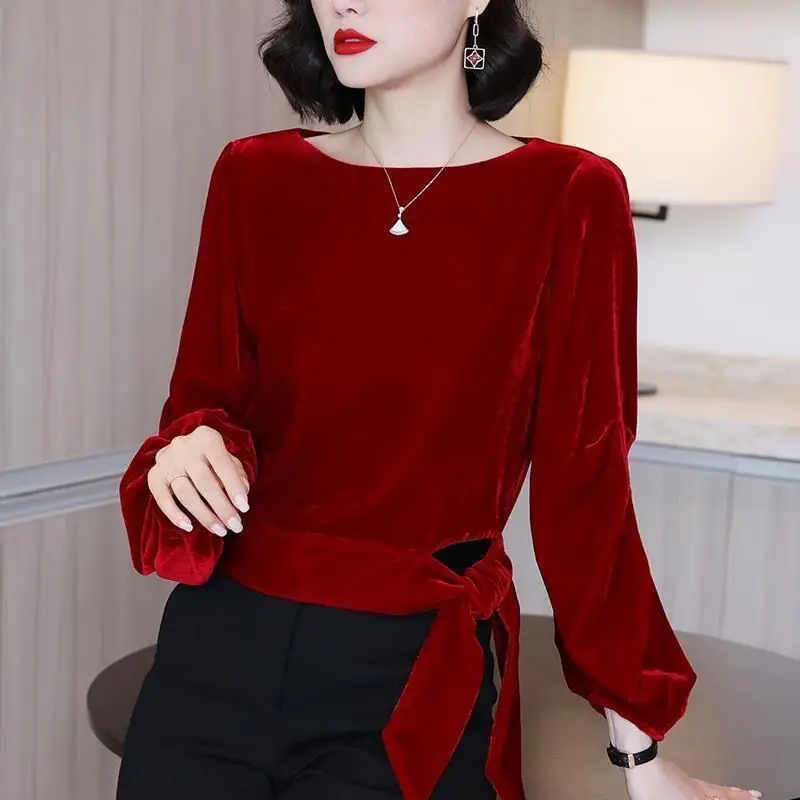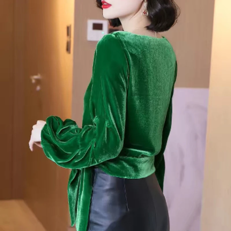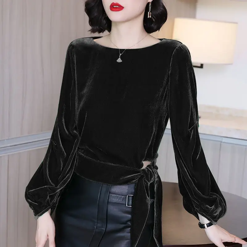 Korean Solid Velvet Women’s Tops Long Sleeve Ruffles Blouses Ladies Shirt Tops Femme Plus Size