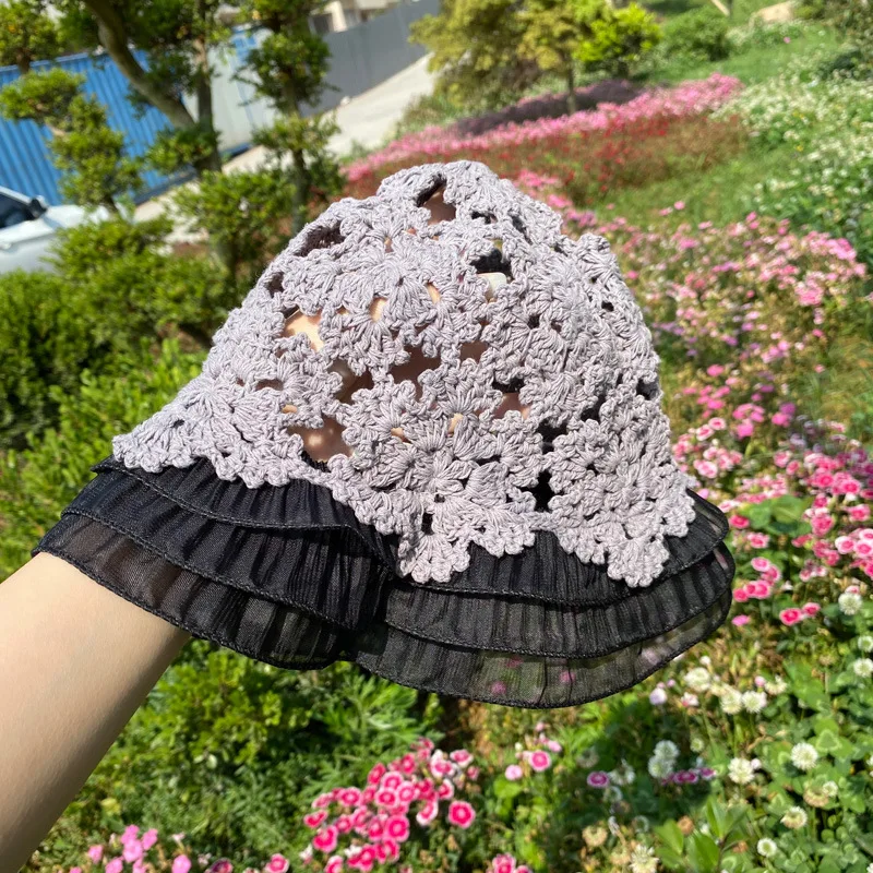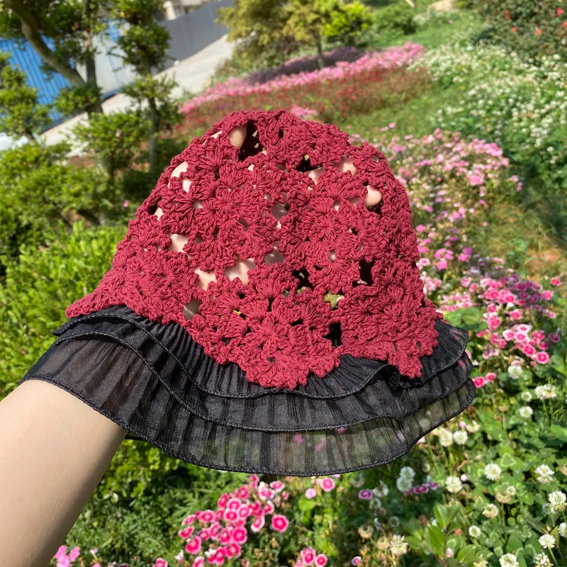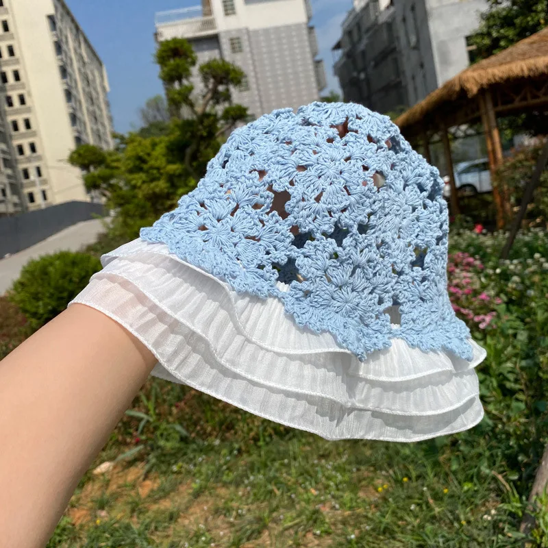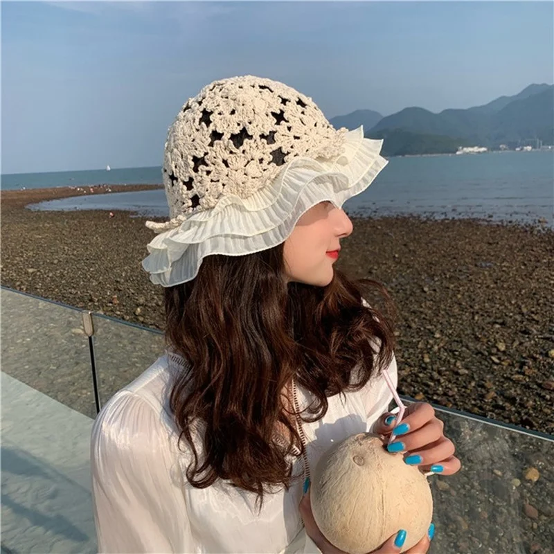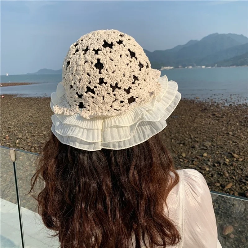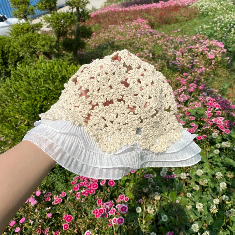 Lace Knit Hollow Bucket Hats Crochet Thread Hat Lace Flower Cute Girls’ Sweet Romance Sunshade Hat Knitted Breathable Bucket Hat