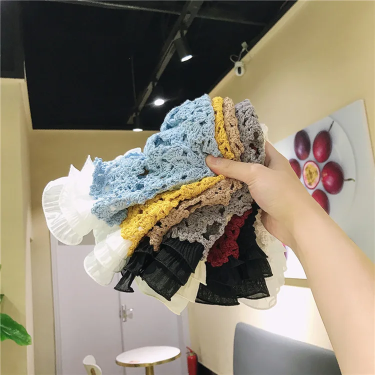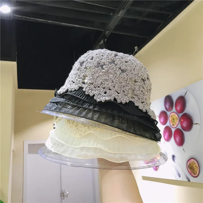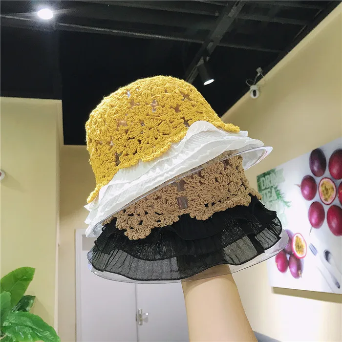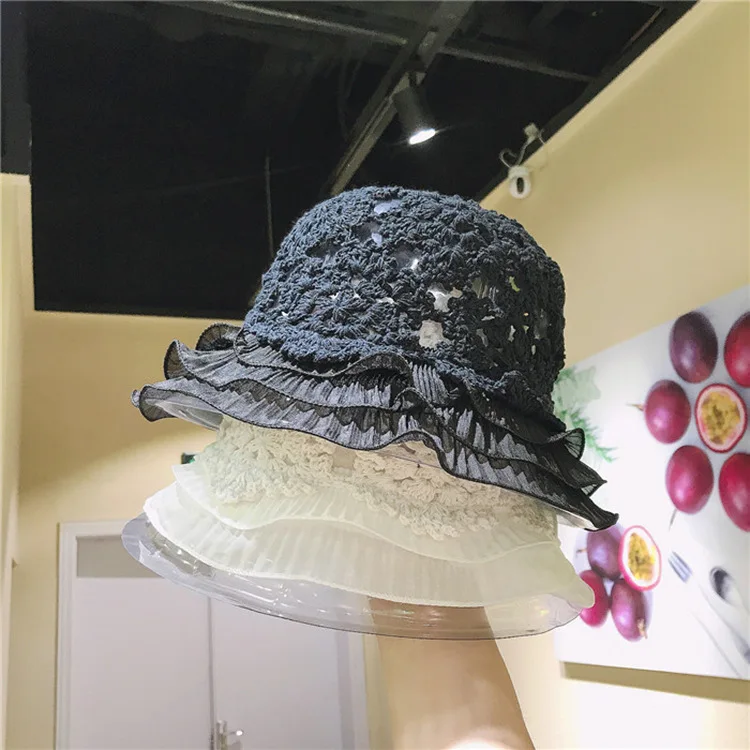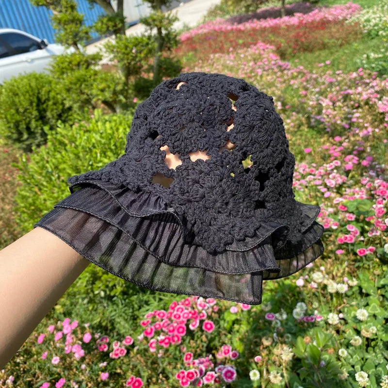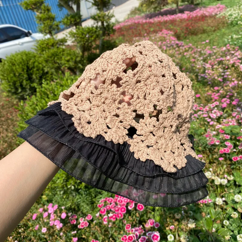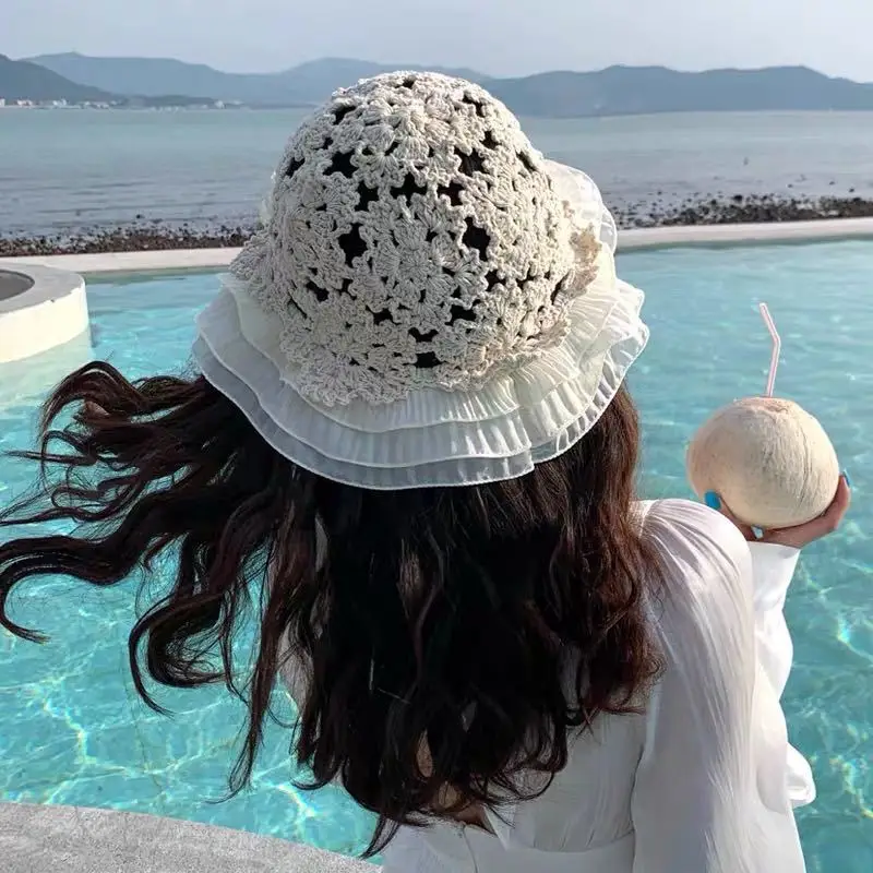 Lace Knit Hollow Bucket Hats Crochet Thread Hat Lace Flower Cute Girls’ Sweet Romance Sunshade Hat Knitted Breathable Bucket Hat