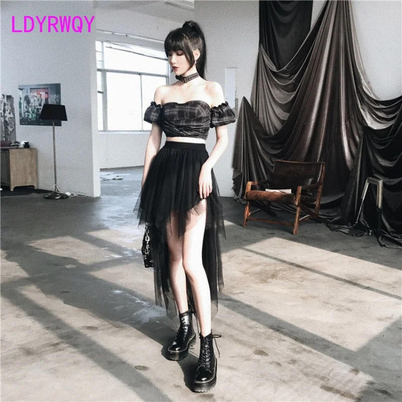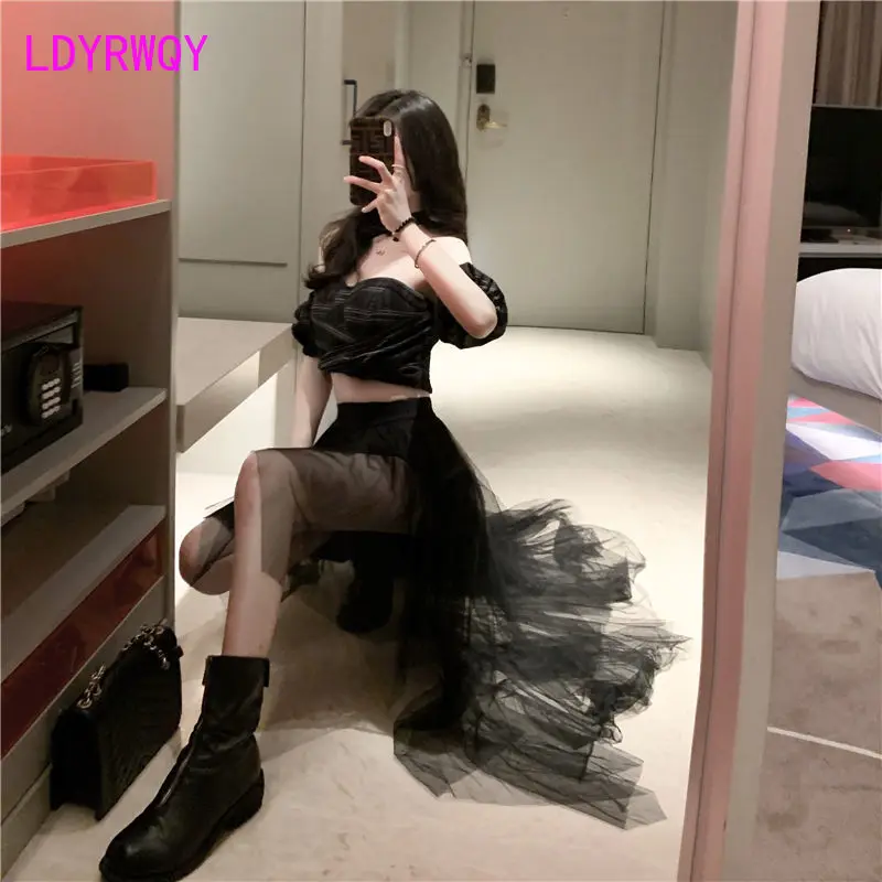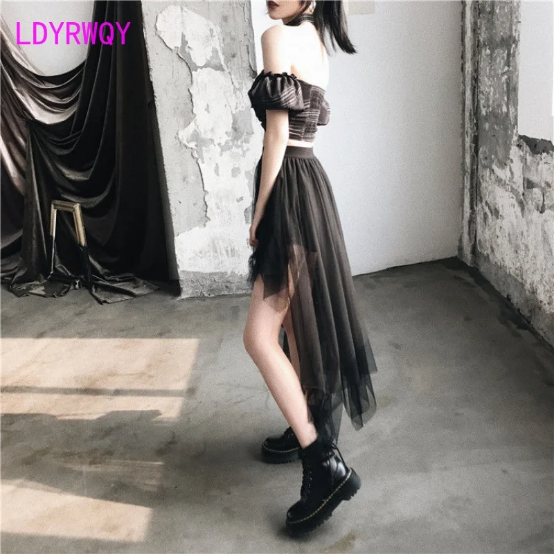 LDYRWQY Women’s High Waist Bust Mesh Skirt Short Front and Long Back 2021 Korean New Office Lady Ball Gown Knee-Length