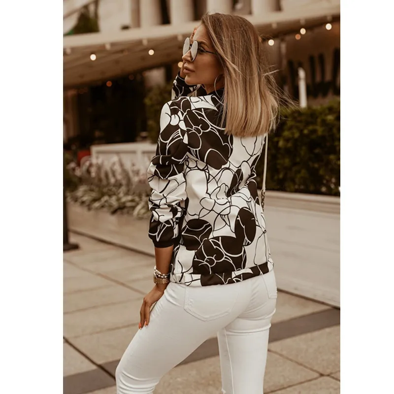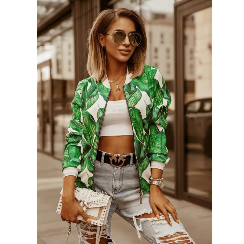 Leosoxs Flower Print Long Sleeve Women’s Bomber Jacket Fashion Zipper Up Vintage Coat Tops Elegant Slim Basic Ladies Jackets