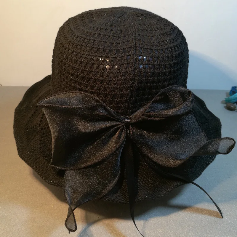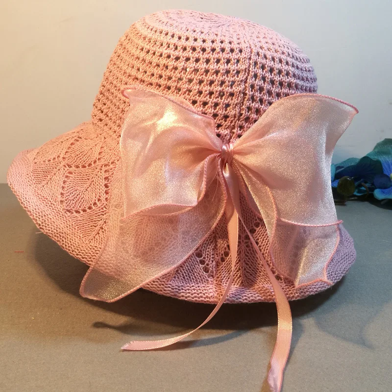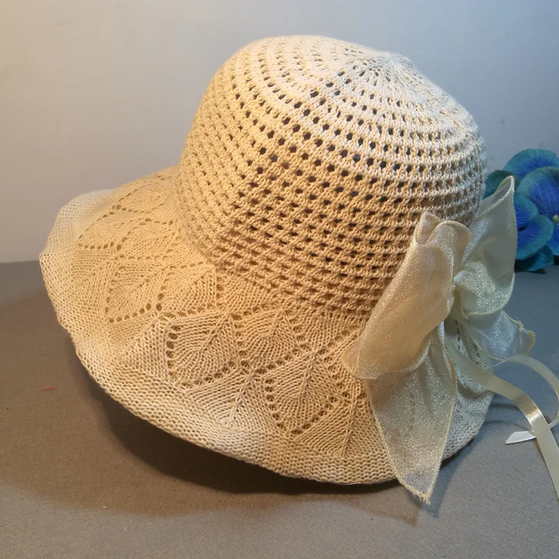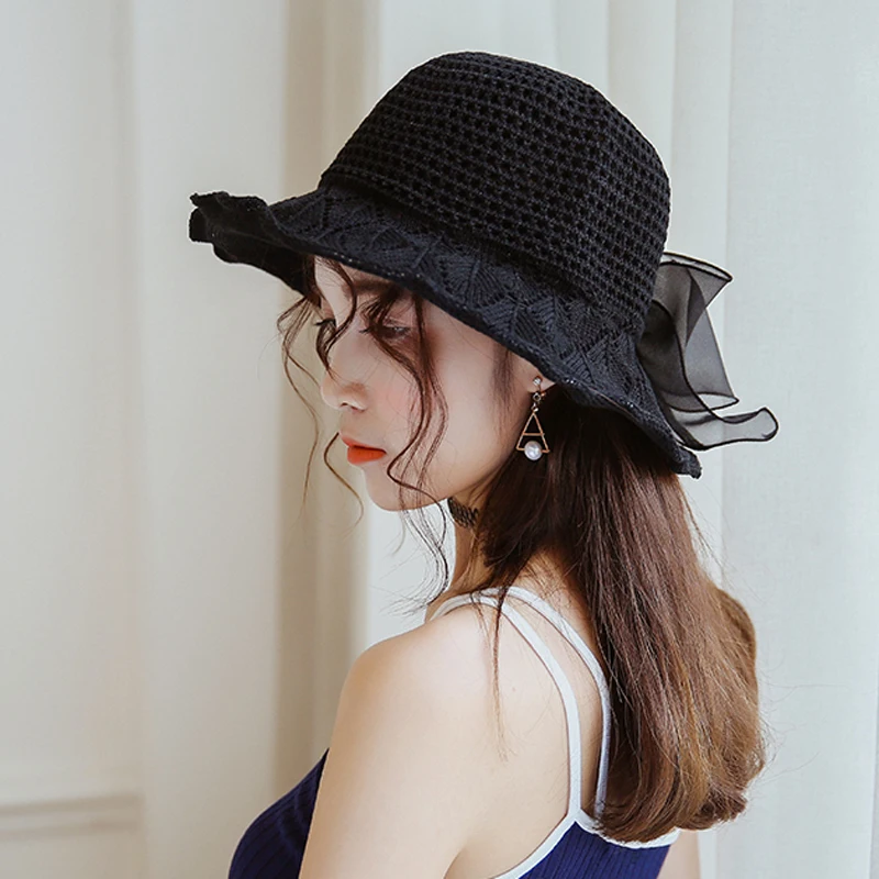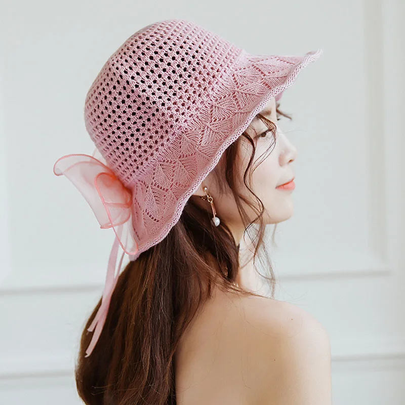 MAXSITI U Hand cap female summer bow openwork knit bucket hat folding outdoor travel shade fisherman hat