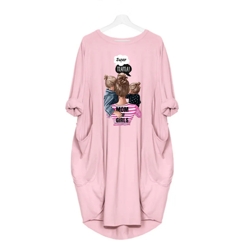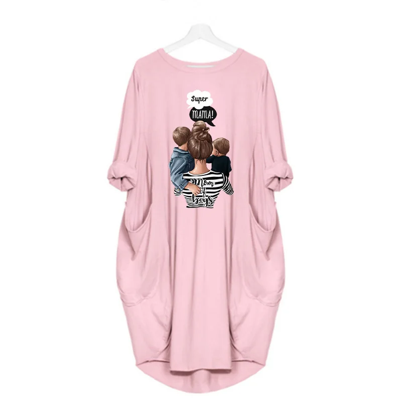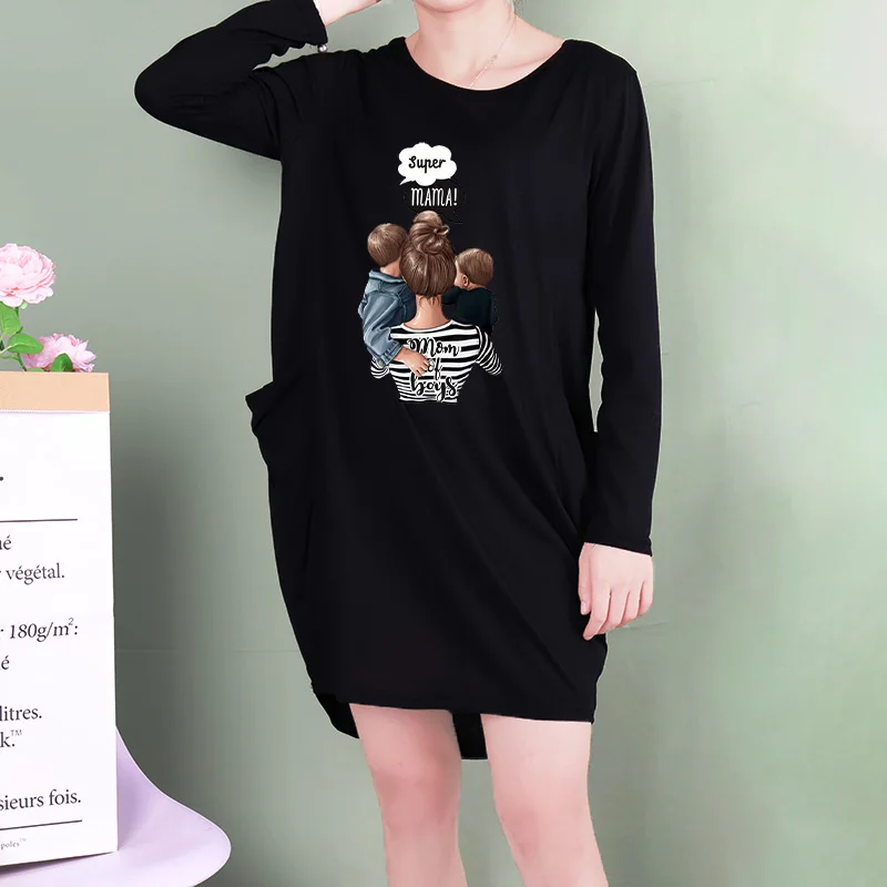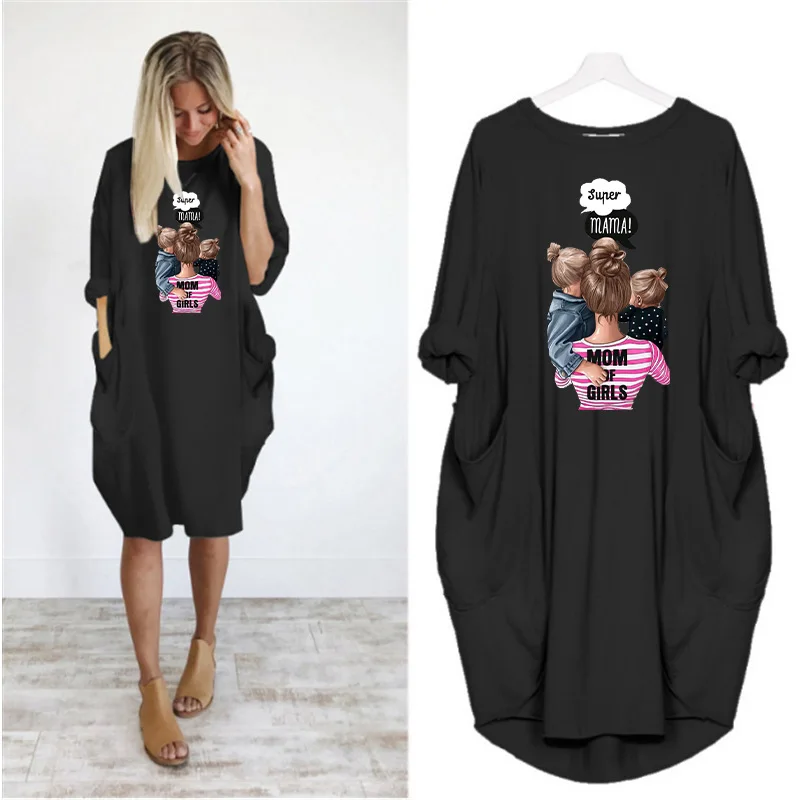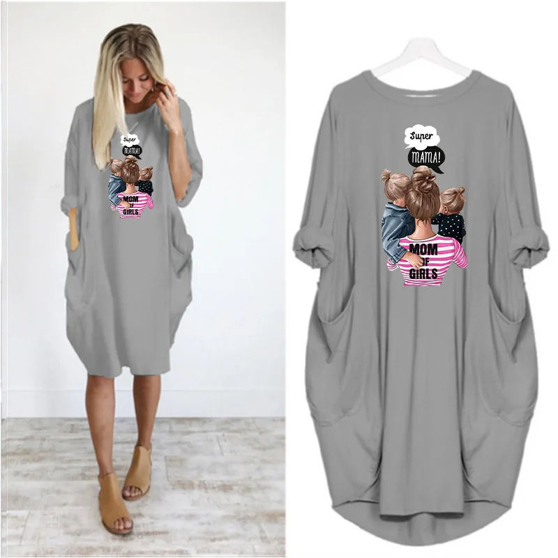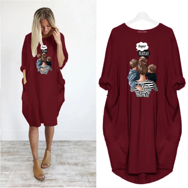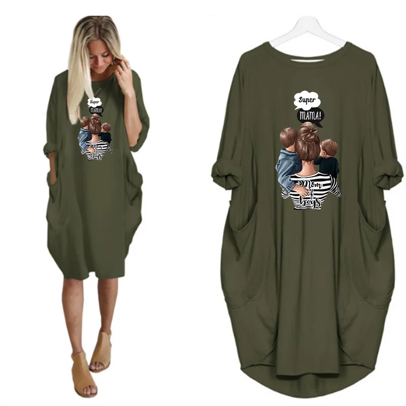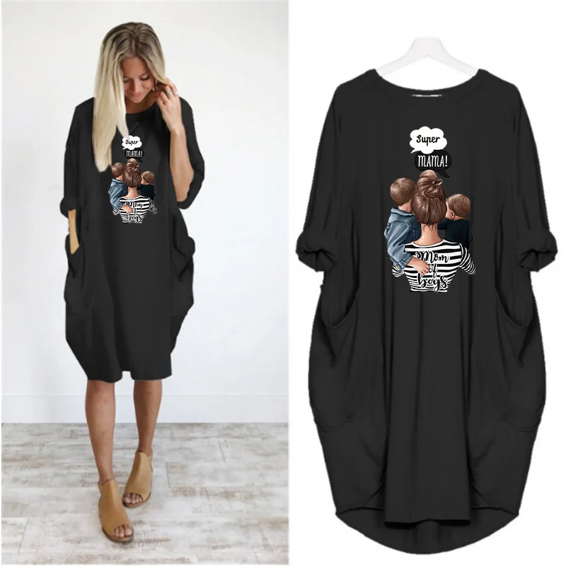 Midi Dress Long Sleeve Loose Dresses for Women Casual 2021 Fall Super Mama Print O Neck Pocket Maternity Vintage Clothes Vestido