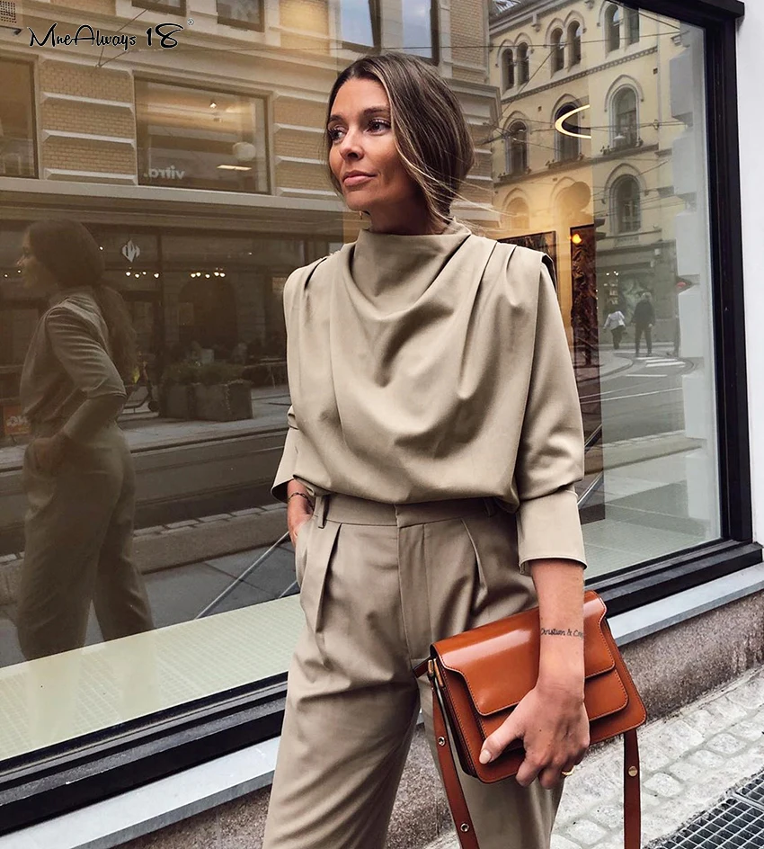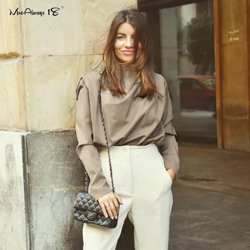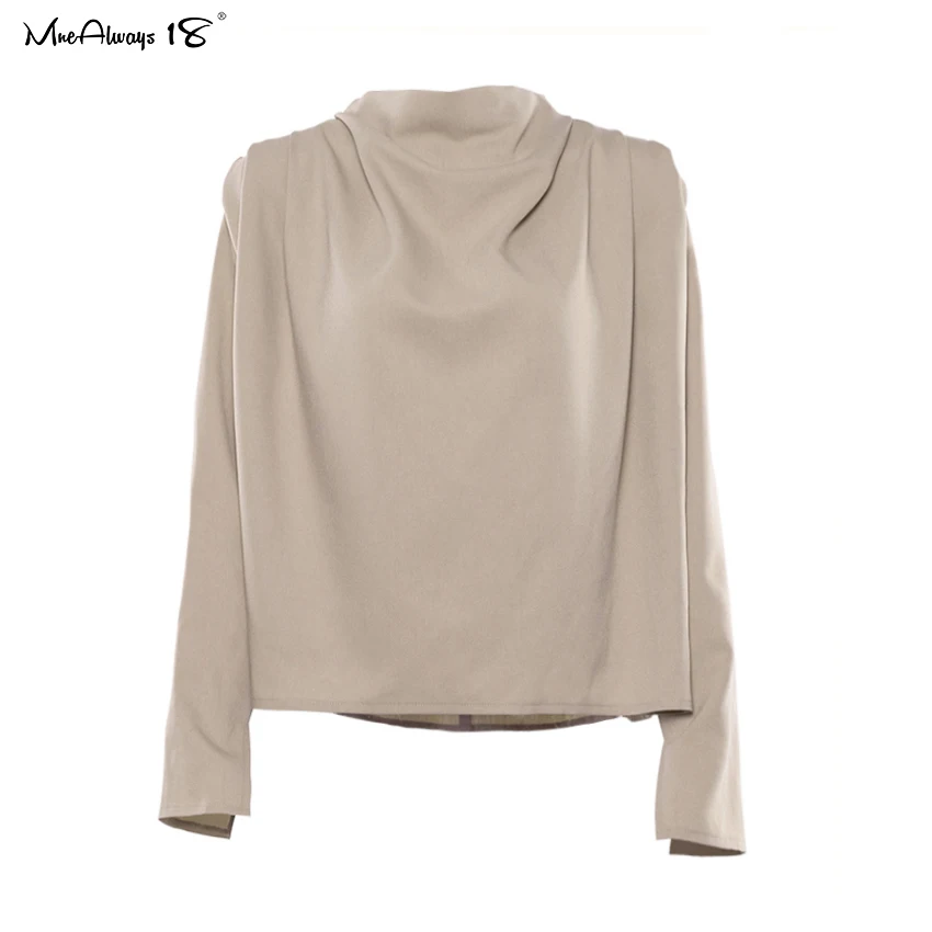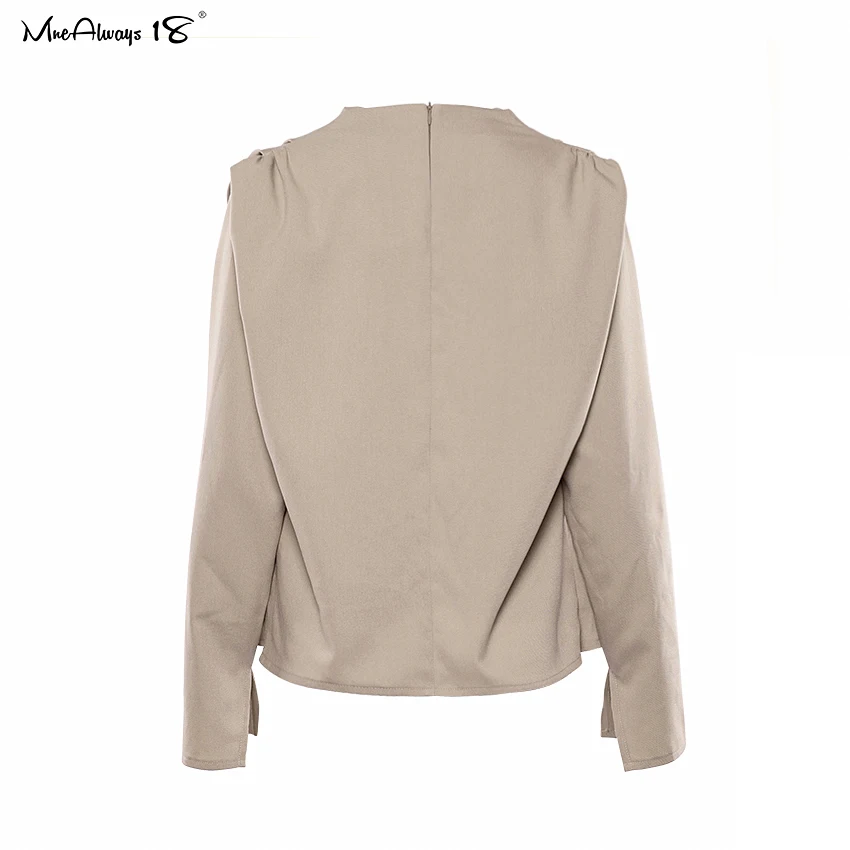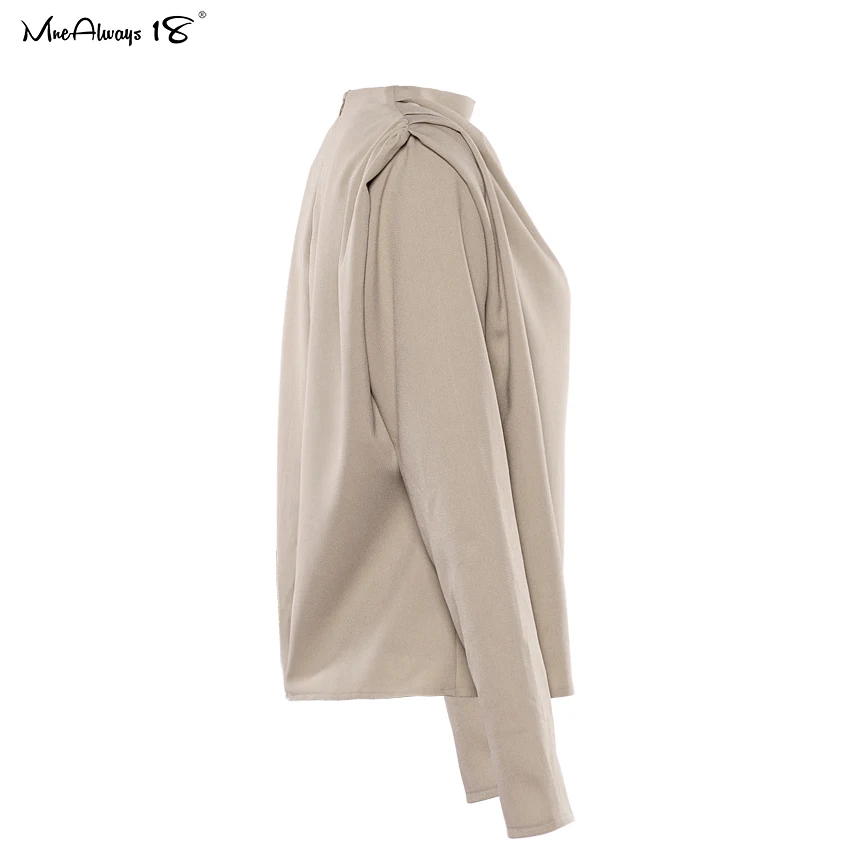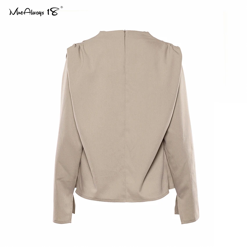 Mnealways18 Draped Solid Khaki Tops And Blouses Spring Elegant Office Blouse Women Ruched Work Top Long Sleeve Ladies Shirt 2020