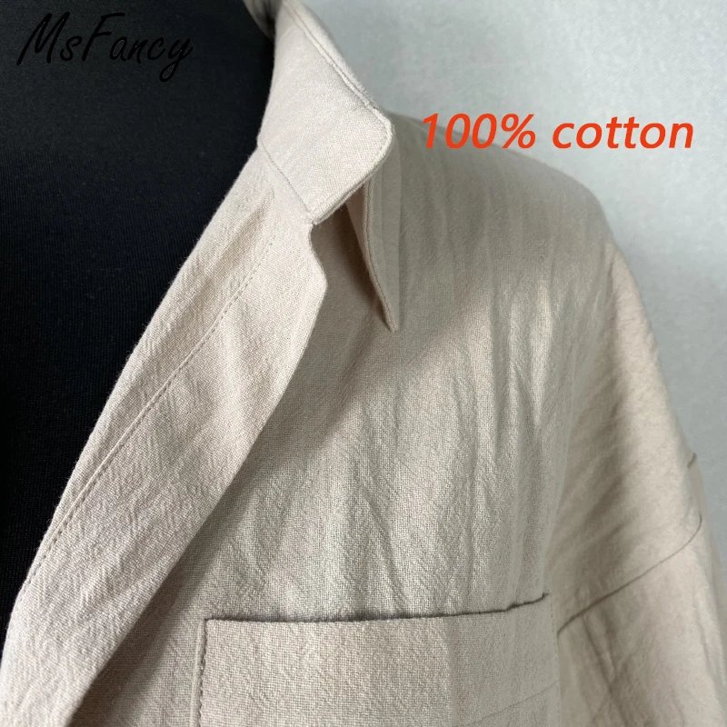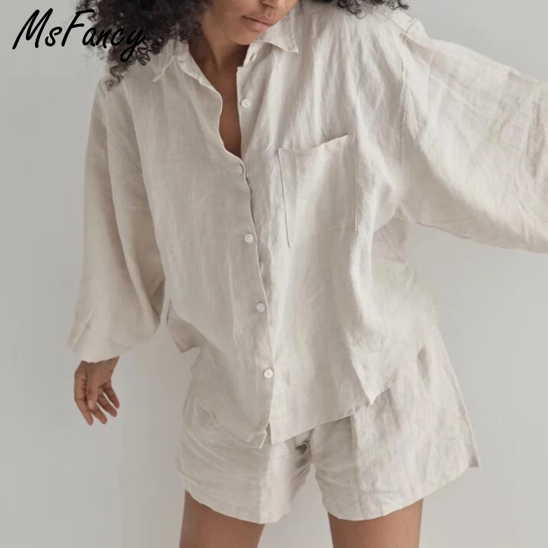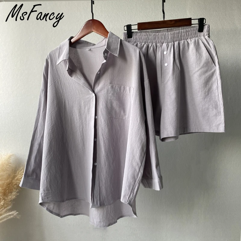 Msfancy Summer Two Piece Set Women 2021 Cotton Shorts Sets Vintage Boho Oversized Shirt High Waist Loose Shorts Mujer Sets