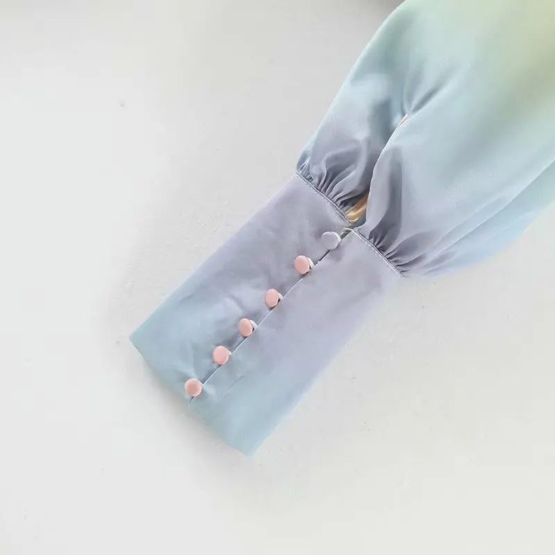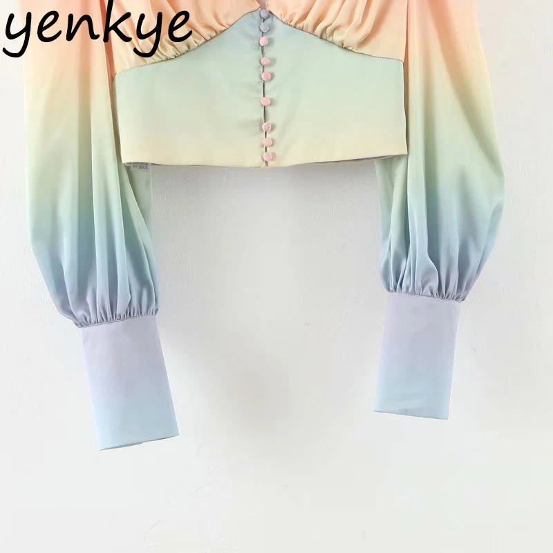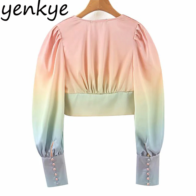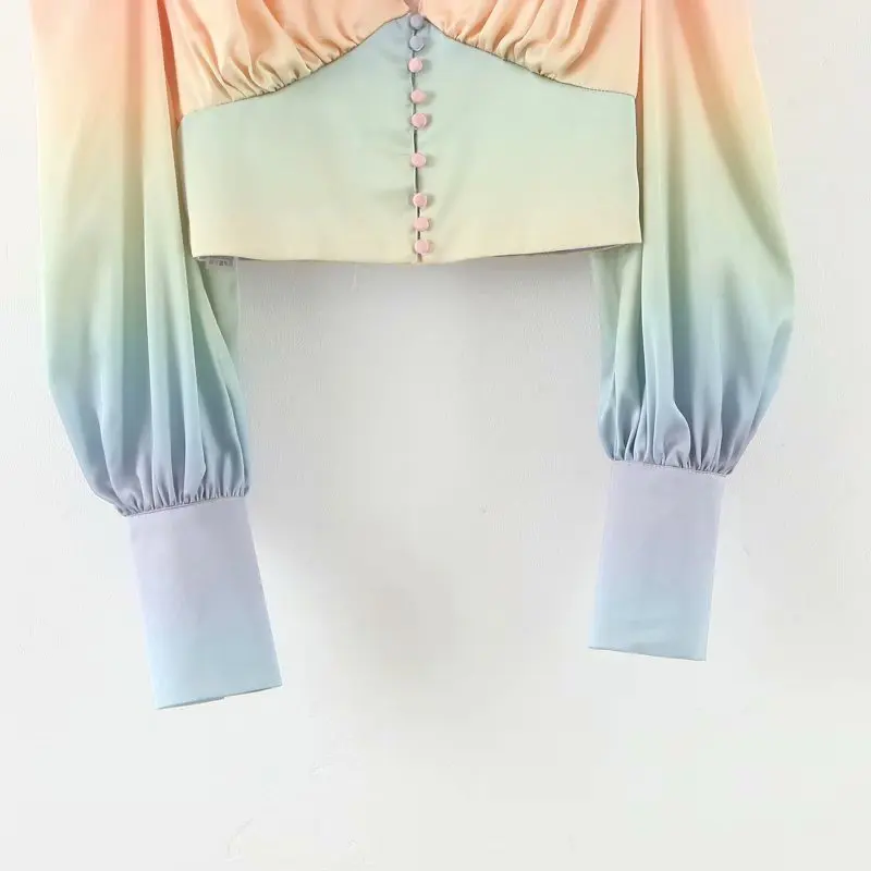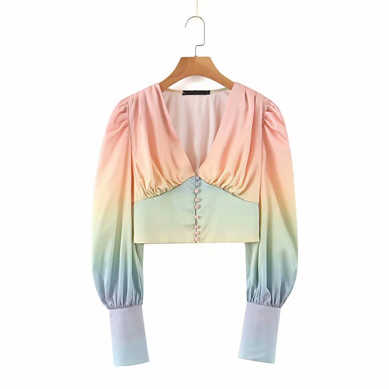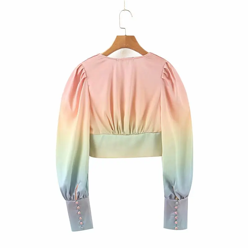 Multicolor Gradient Blouse Shirt Women Lantern Sleeve V Neck Streetwear Crop Top Chemise