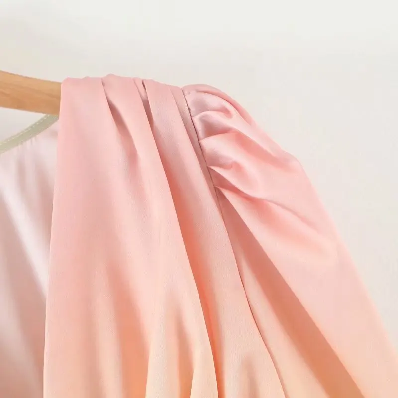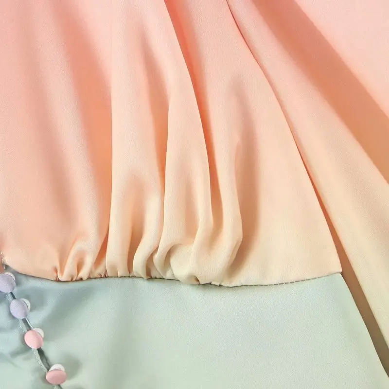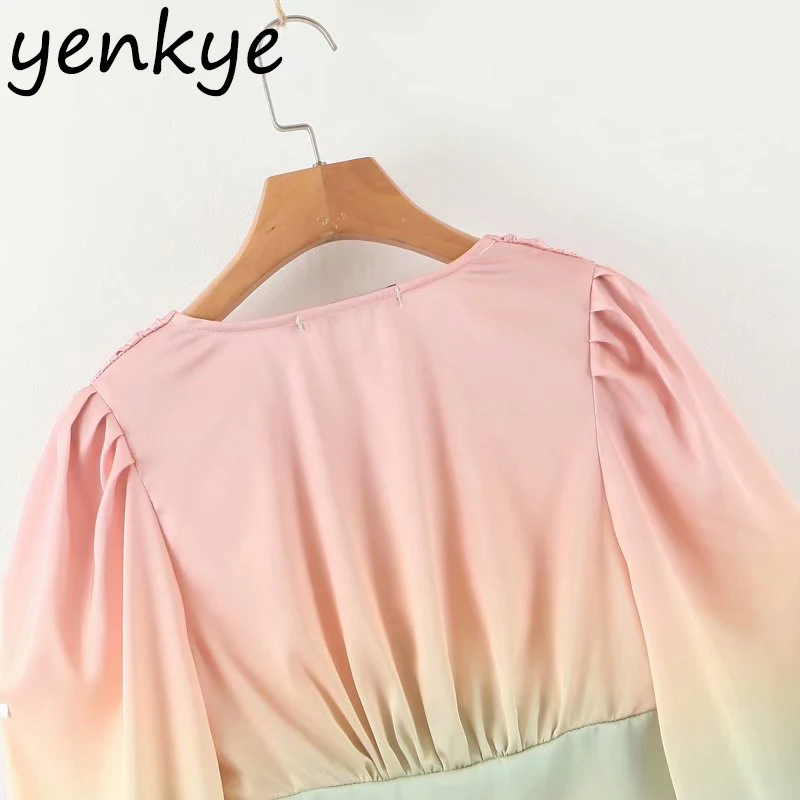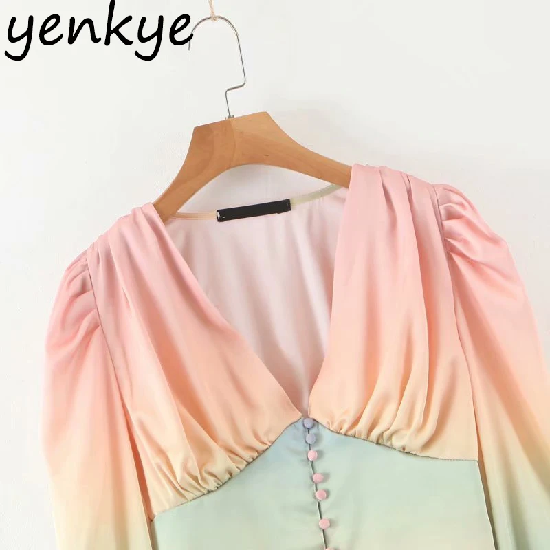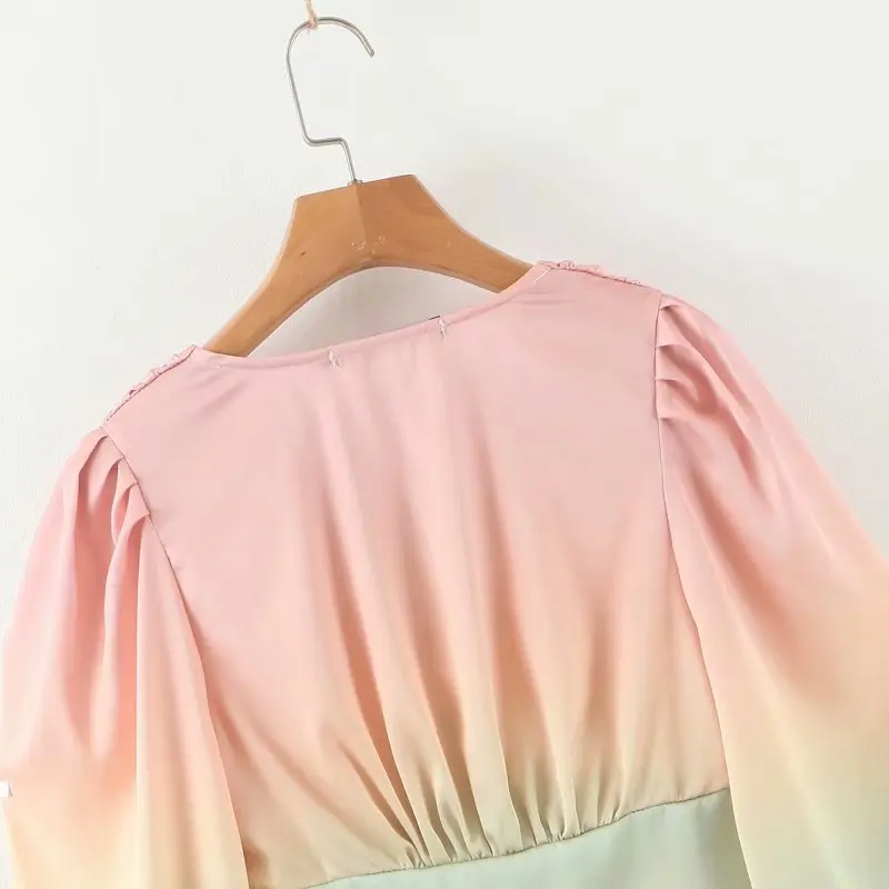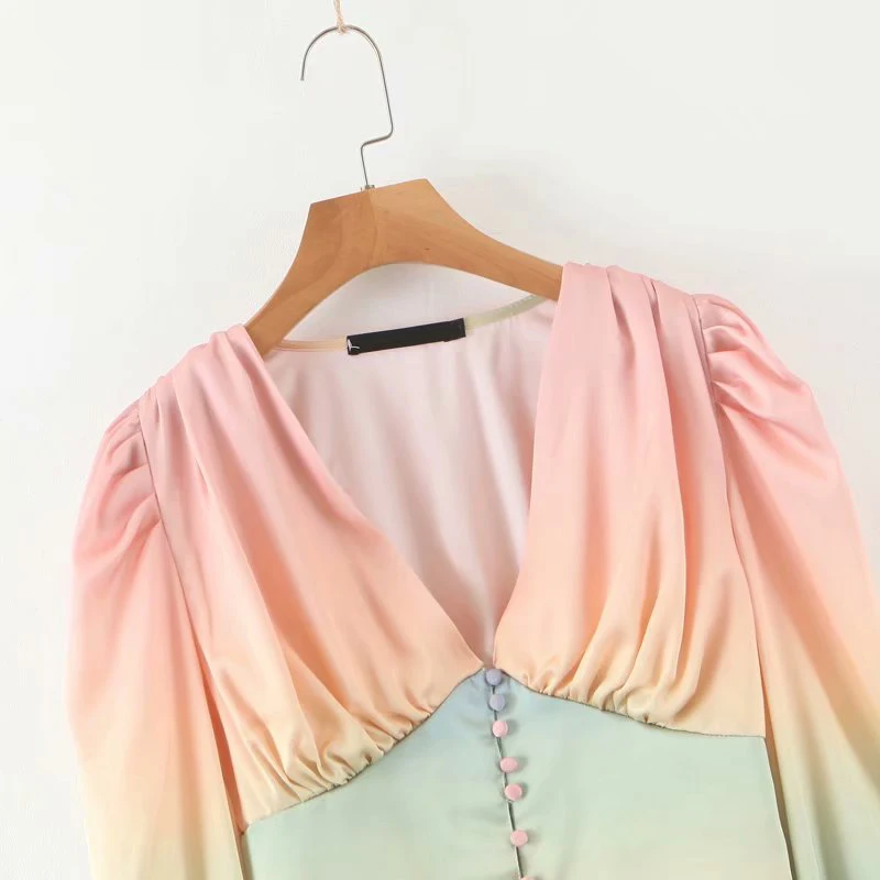 Multicolor Gradient Blouse Shirt Women Lantern Sleeve V Neck Streetwear Crop Top Chemise