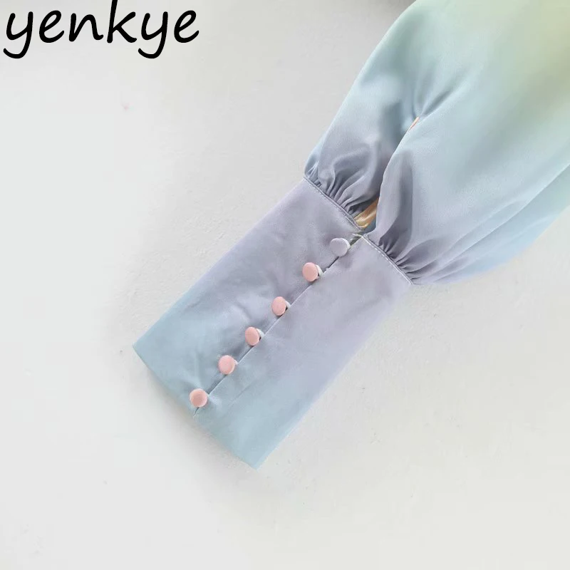 Multicolor Gradient Blouse Shirt Women Lantern Sleeve V Neck Streetwear Crop Top Chemise Femme Summer Chiffon Blouses blusas