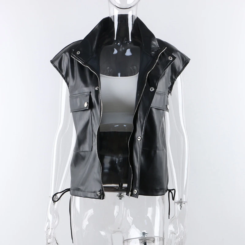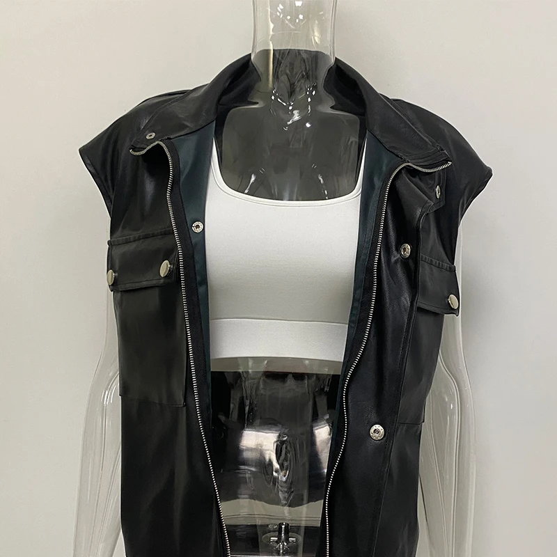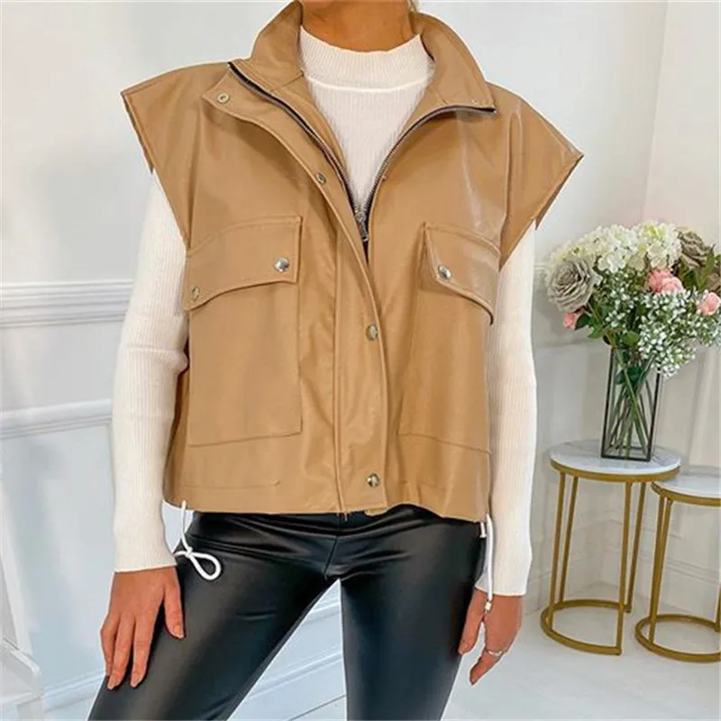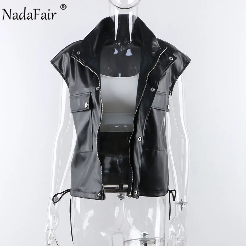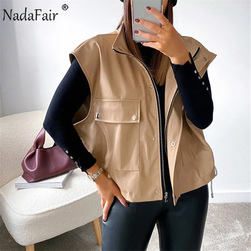 Nadafair Faux Leather Jacket Coat Women 2021 Spring Casual Pu Pockets Zipper Shrug Winter Sleeveless Jackets Coats Woman Vest