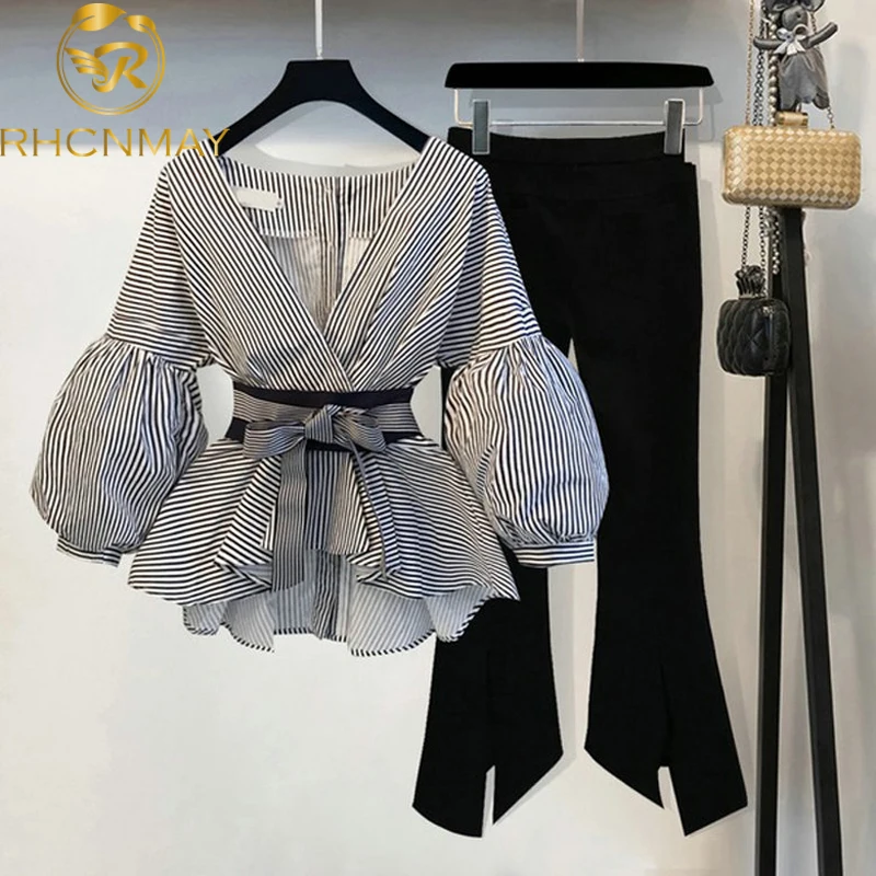 New 2020 Spring Summer 2 Pcs Suits Women’s Striped Bow Lantern Sleeve Blouse + Black Split Flare Sleeve Pants Set S-3XL