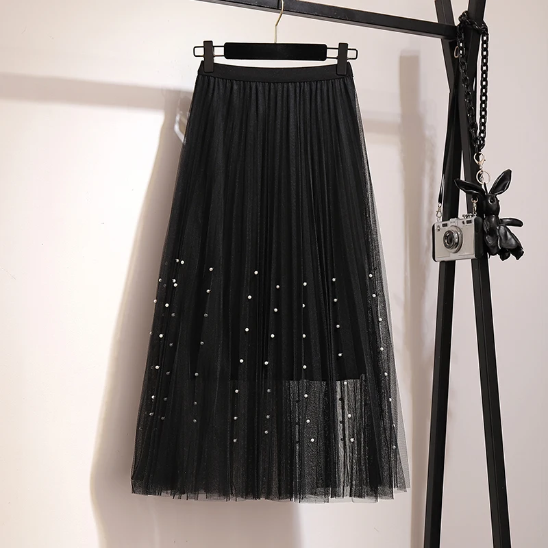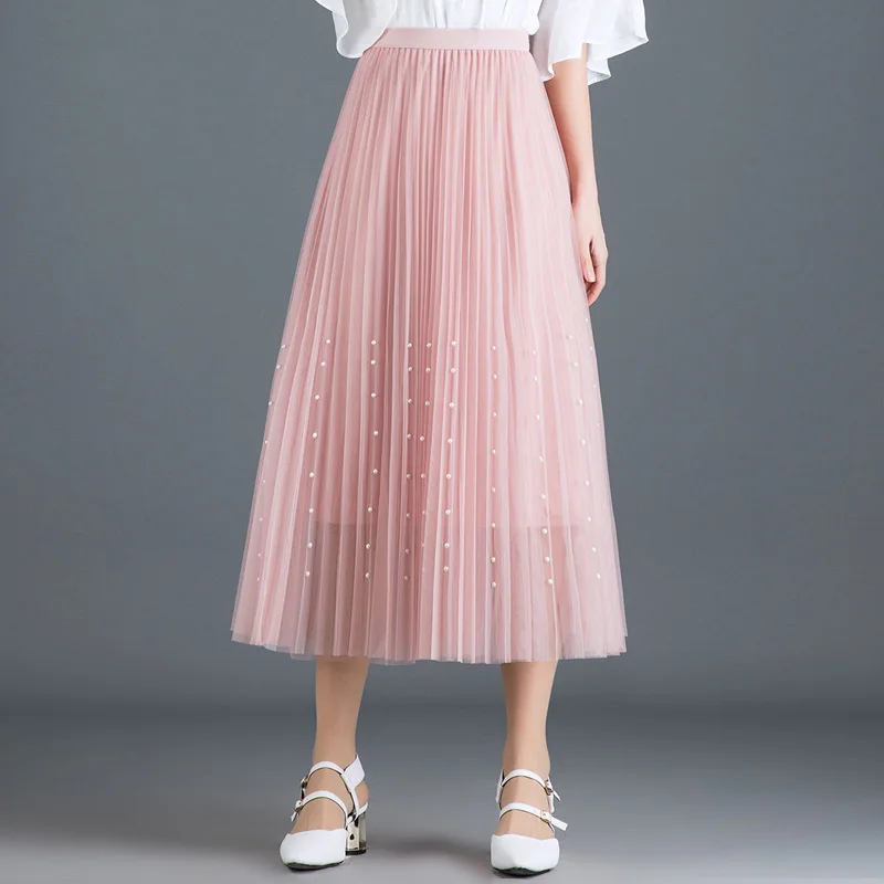 New 2020 Spring Summer Skirts Womens Beading Mesh Tulle Skirt Women Elastic High Waist A Line Mid Calf Midi Long Pleated Skirt