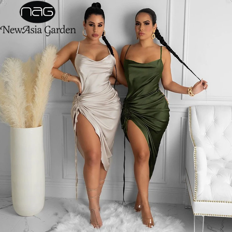 NewAsia Ruched Satin Summer Dress Drawstring Spaghetti Straps Cowl Neck Backless Long Dresses for Women Party Sexy Vestidos 2020