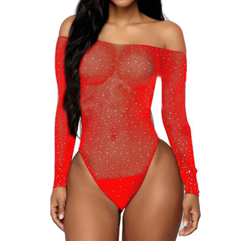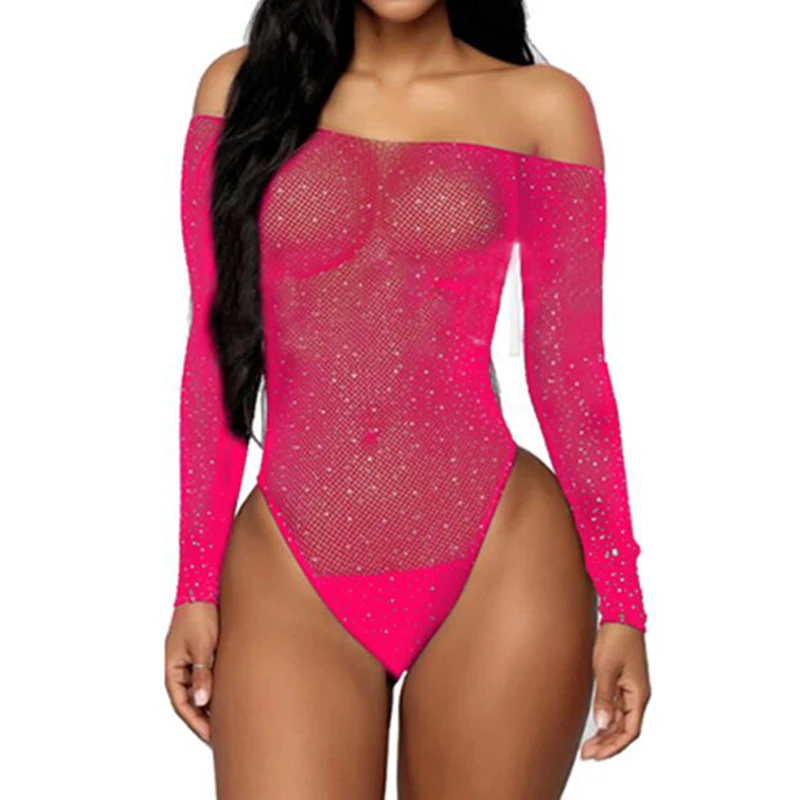 OMSJ Lady Glitter Rhinestones Slash Neck Sexy Bodysuit Fishing Net Mesh Transparent Full Sleeve Backless Slim Club Party Rompers