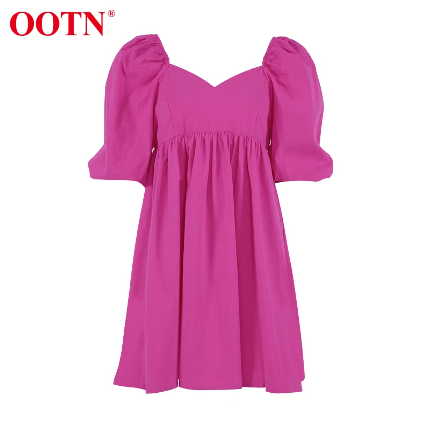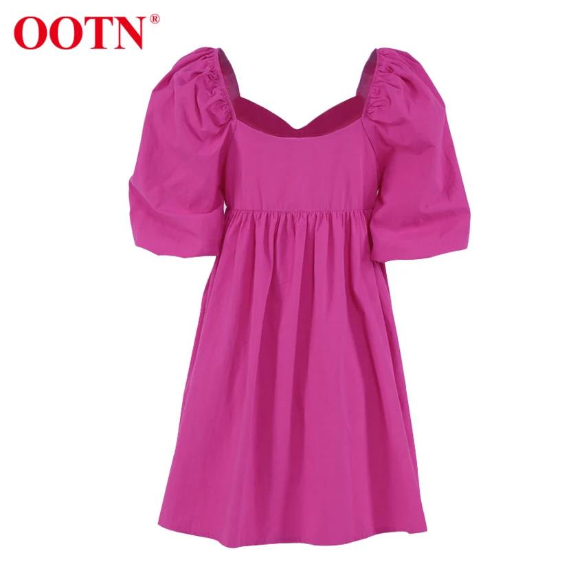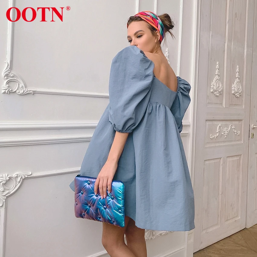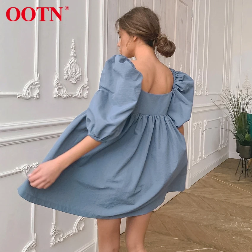 OOTN Square Neck Sexy Summer Mini Dress Short Sleeve Female High Waist Black Loose A Line Women Dress Puff Sleeve Blue Cotton