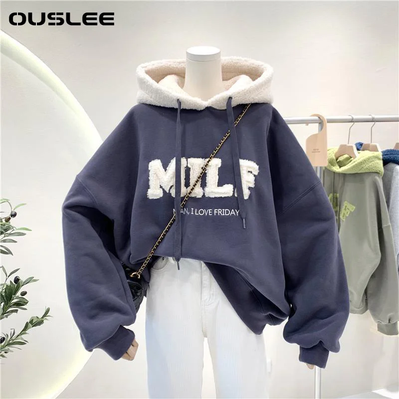OUSLEE Fashion Patchwork Oversize Sweatshirt Women Winter Casual Loose Cotton Thick Letter Long Sleeve Hoodies Female Streetwear