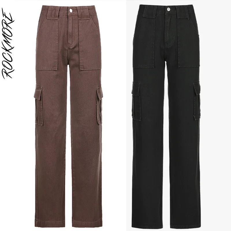Rockmore Brown Vintage Baggy Jeans Women 90s Streetwear Pockets Wide Leg Cargo Pants Y2K Low Waist Straight Denim Trousers 2021