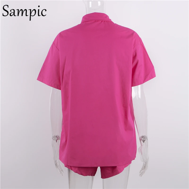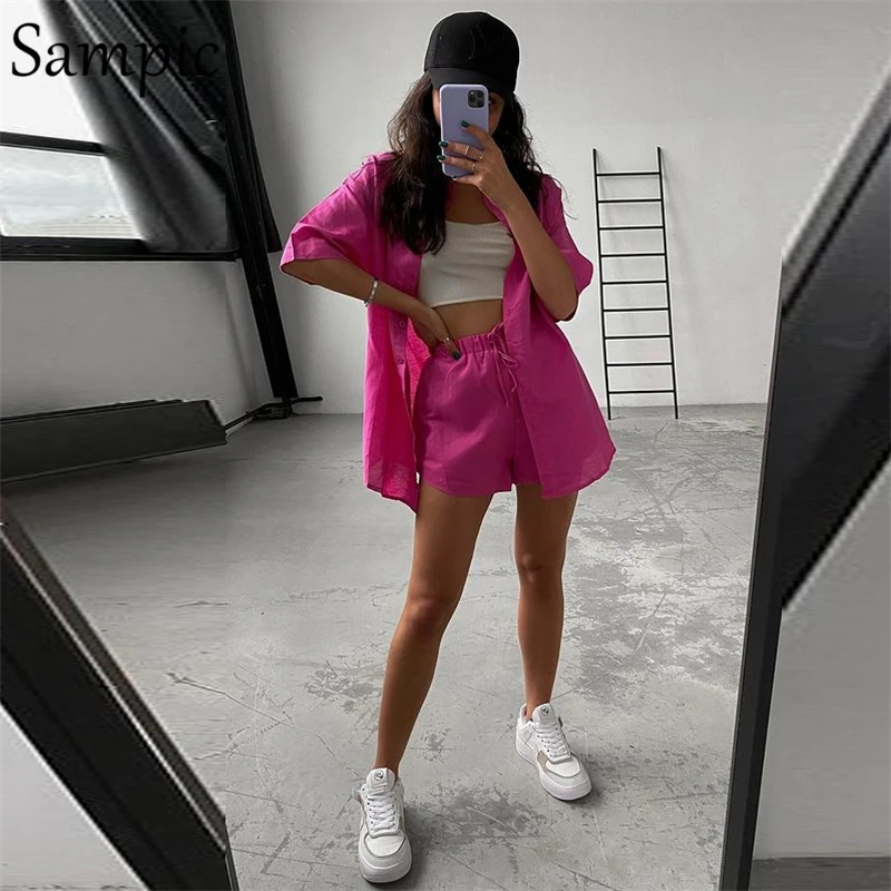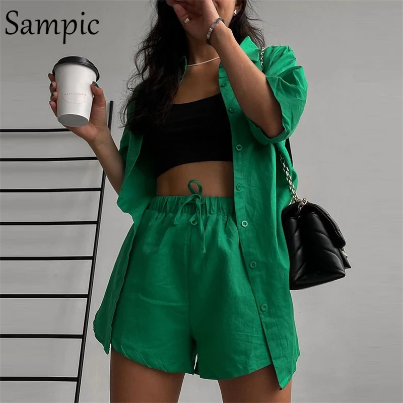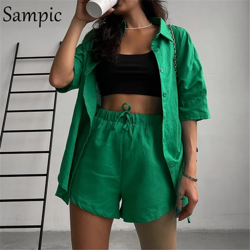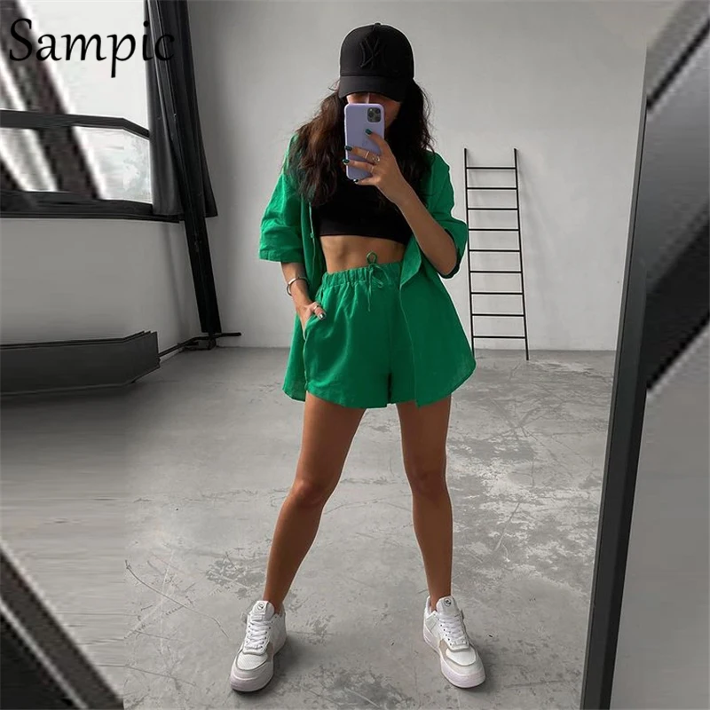Sampic Casual Lounge Wear Summer Green Tracksuit Women Shorts Set Short Sleeve Shirt Tops And Loose Mini Shorts Two Piece Set