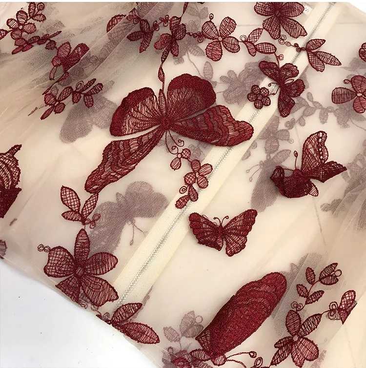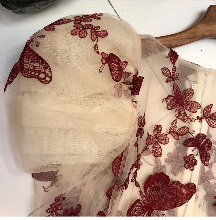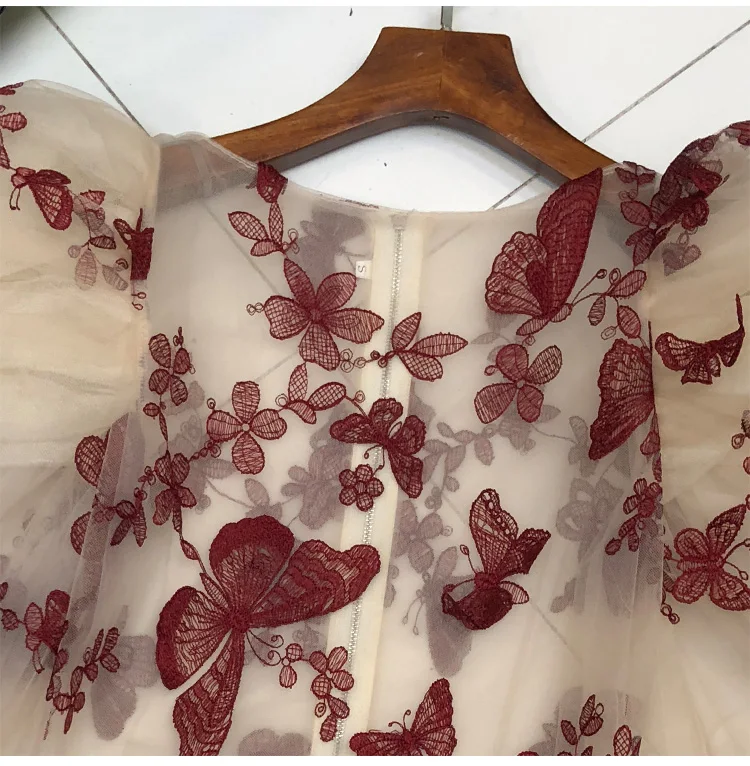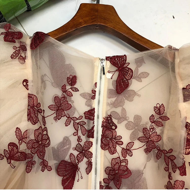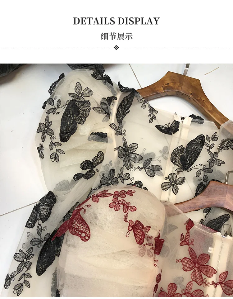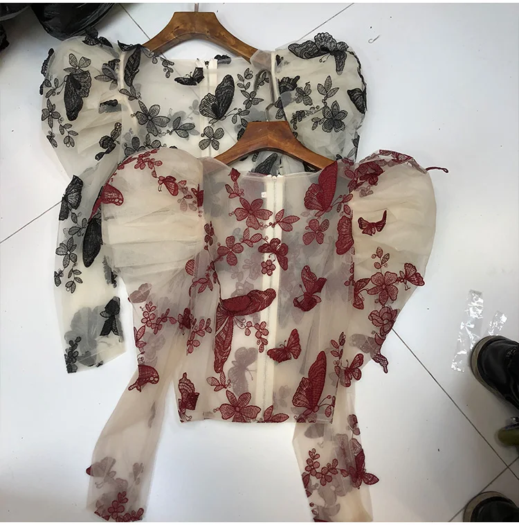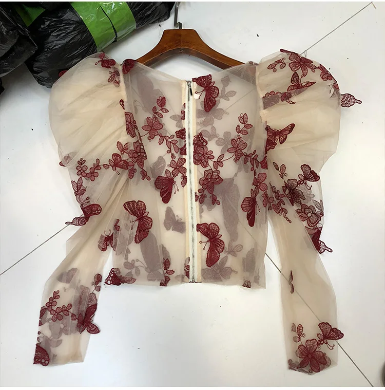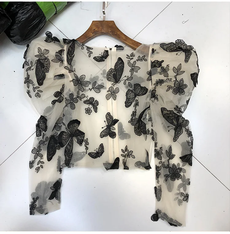 Sexy Women Lady Crochet Mesh Sheer See-Through Long Puff Sleeve Tops Shirt O-Neck Casual Butterfly Embroidered Blouse Top