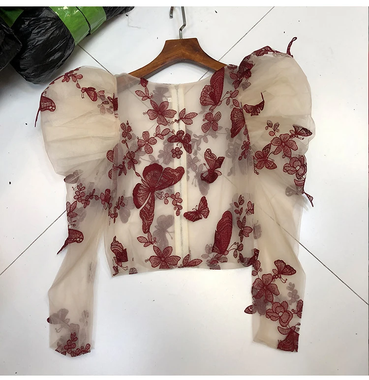 Sexy Women Lady Crochet Mesh Sheer See-Through Long Puff Sleeve Tops Shirt O-Neck Casual Butterfly Embroidered Blouse Top