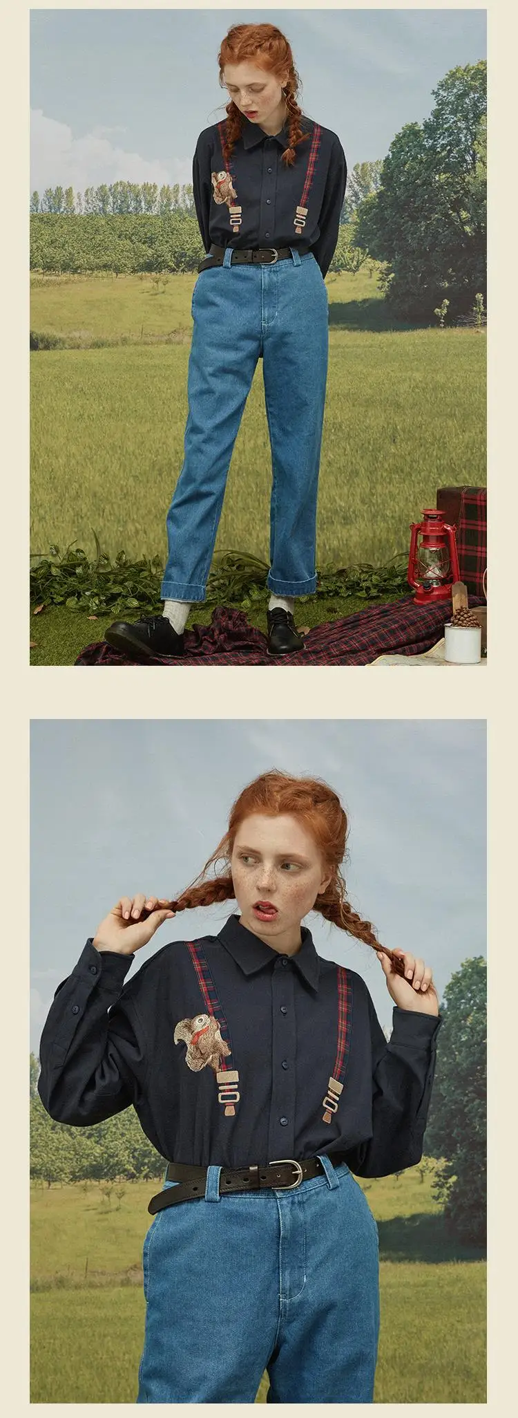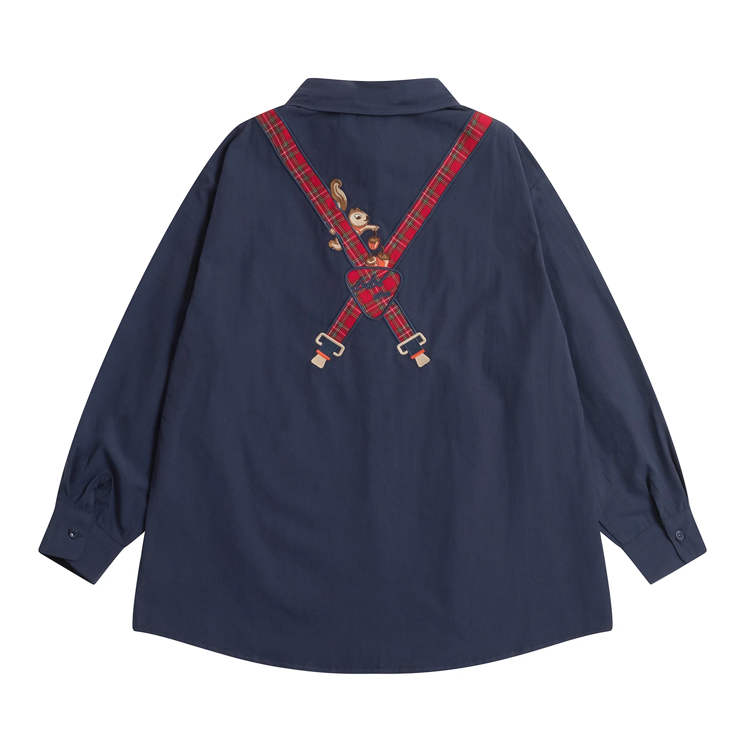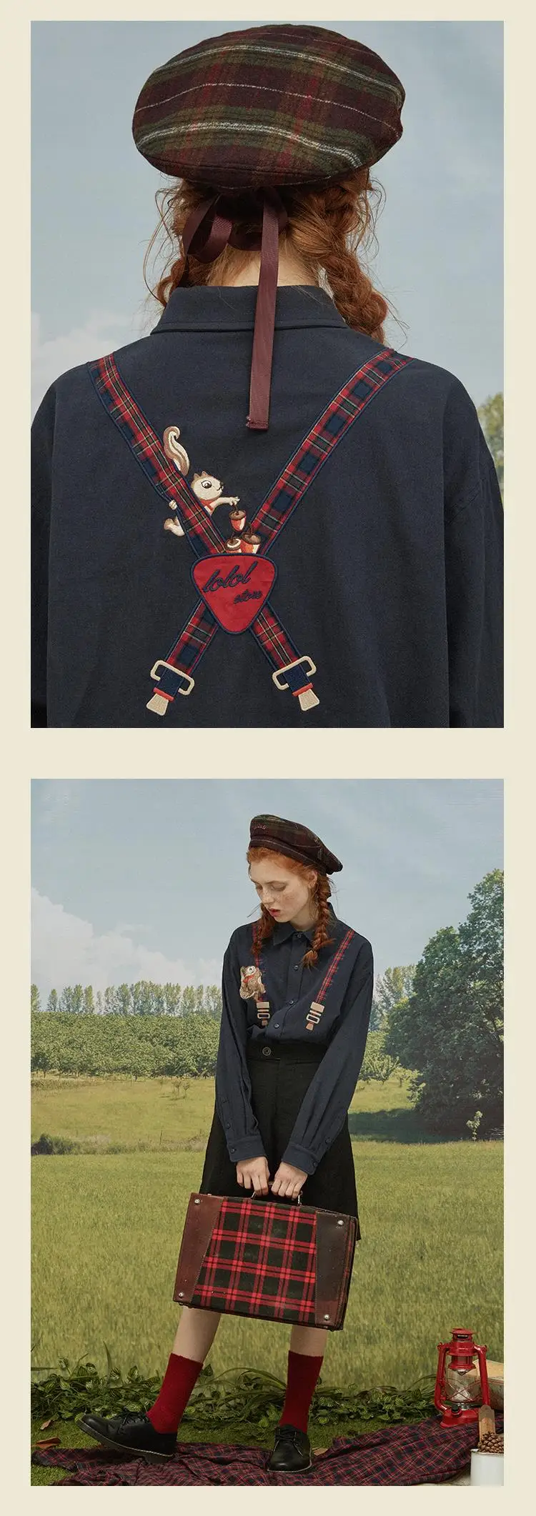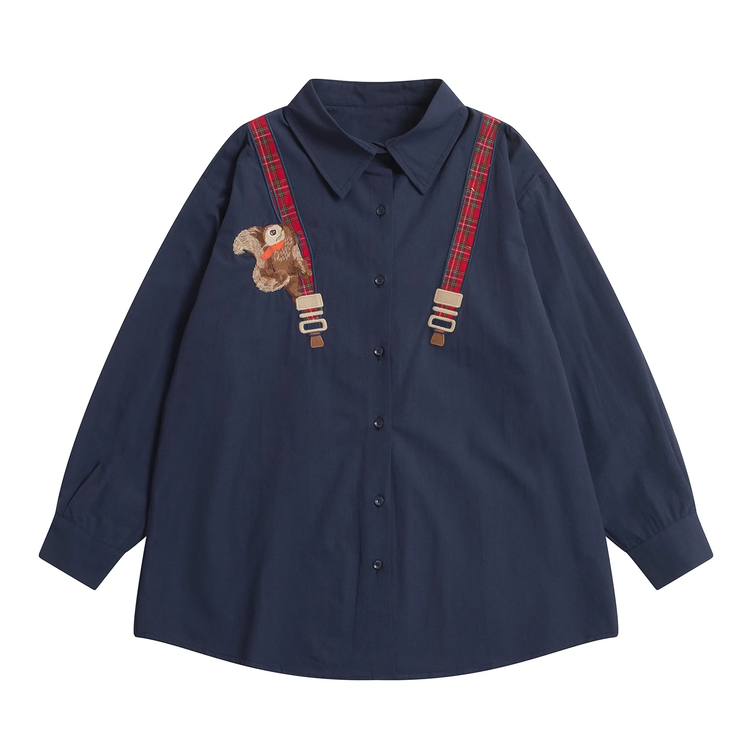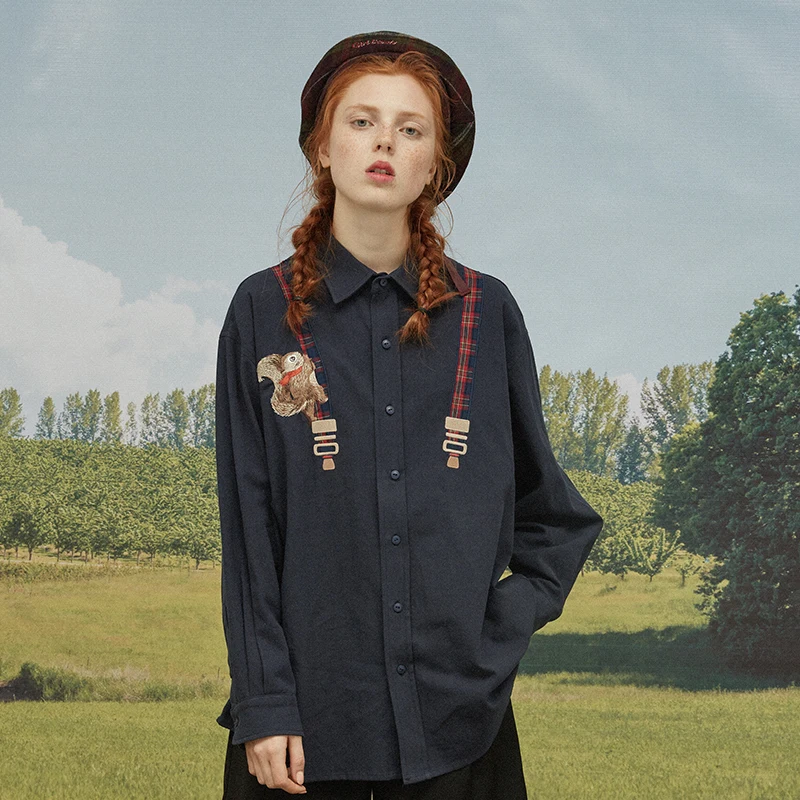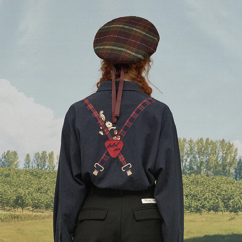 Spring High Quality Fashion Design Women Cotton Blouse Long Sleeve Turn Down Collar Ladies Loose Shirt Tops Squirrel Plaid Patch