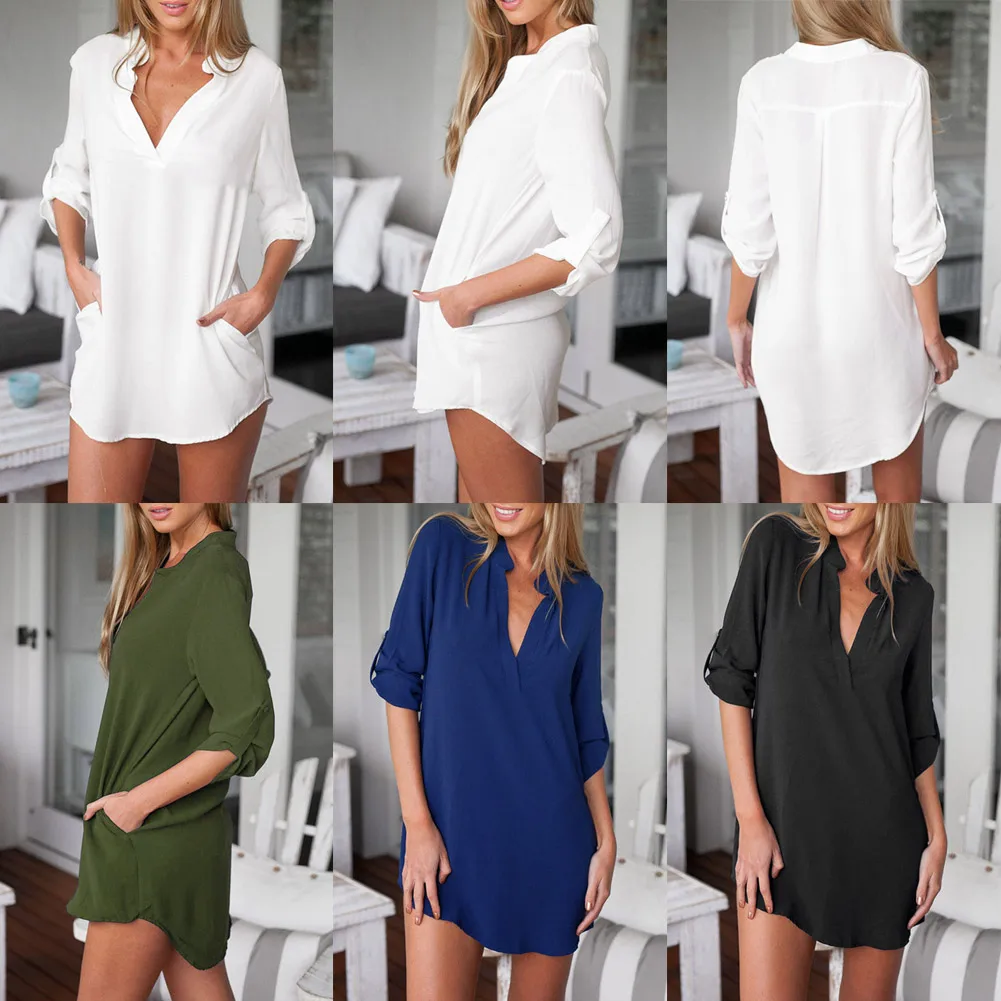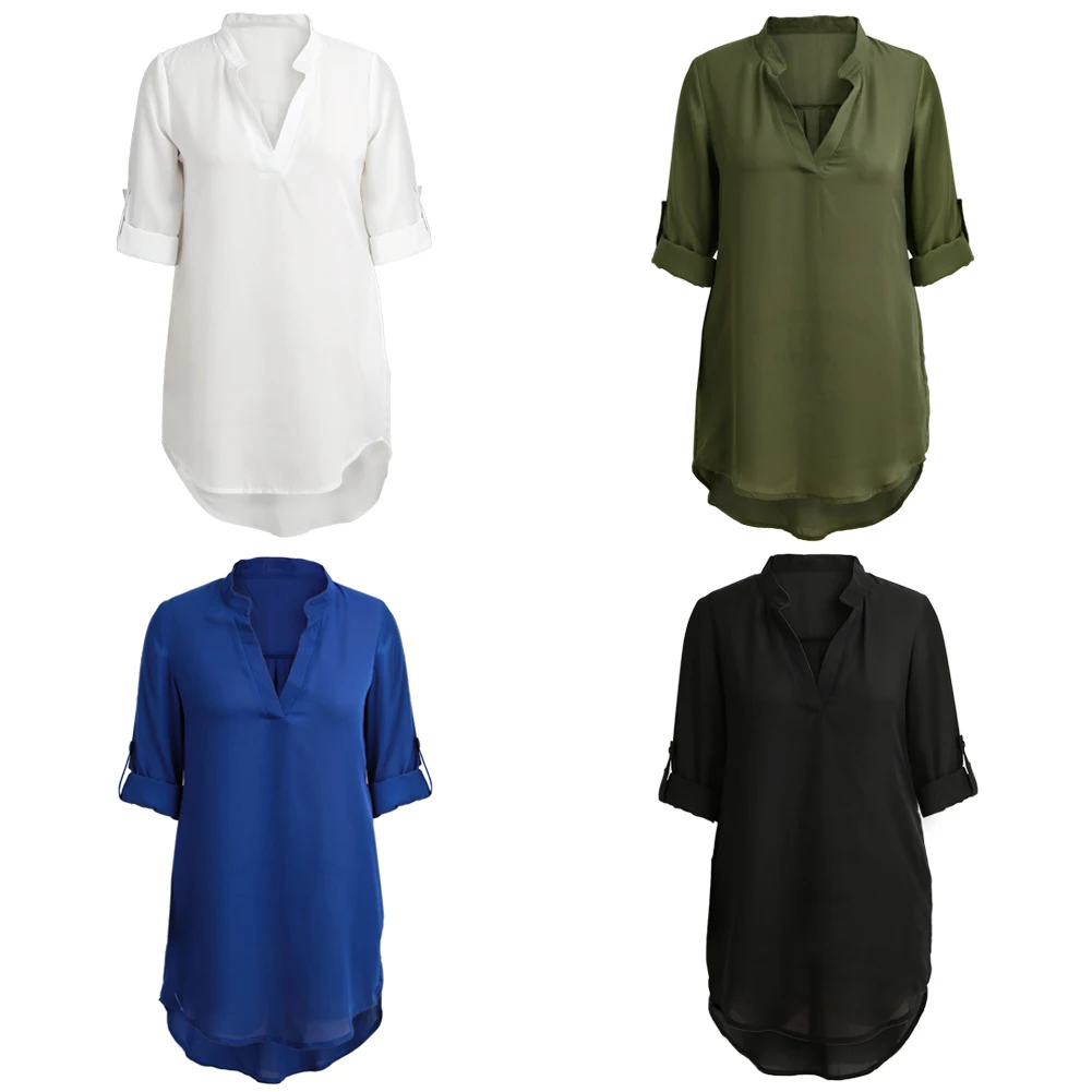 Dress this solid tunic shirt for a day out with friends. Featured in solid color, thin chiffon fabric and asymmetrical hem, this shirt dress makes you stylish all the time. The mandarin collar ends with a deep V neckline, showing sexy curves. Long sleeve is designed with button and interior strap to make a rolled up look. And there is pocket to both sides. Dress it alone or match it with a wide waistband to have different looks.