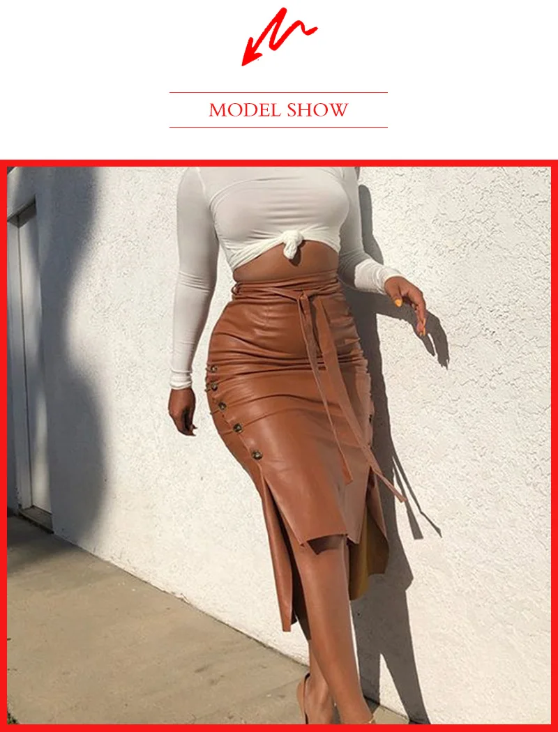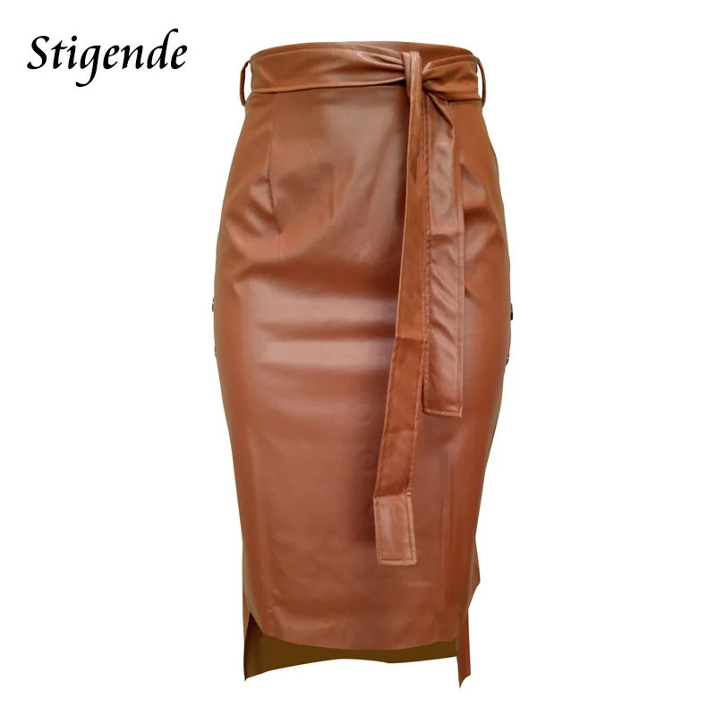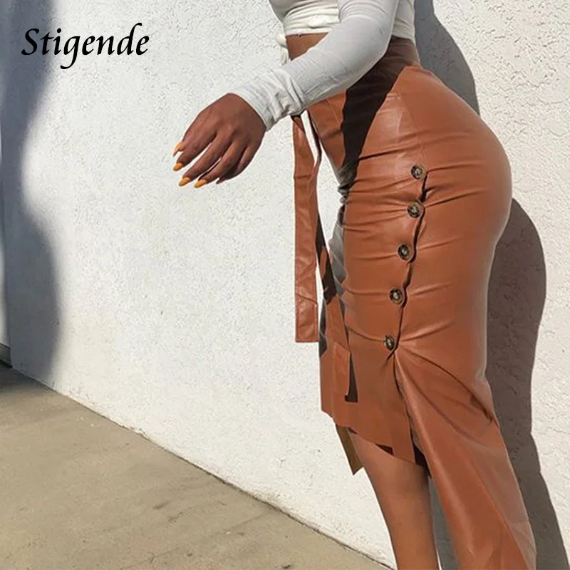 Stigende Women Sexy Bandage Pu Leather Party Skirt Fashion Solid Faux Leather Side Button Skirt Casual Bodycon Split Midi Skirt