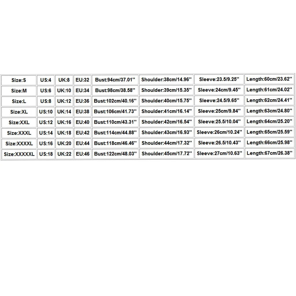 | Size | US | UK | EU | Bust | Shoulder | Sleeve | Length |