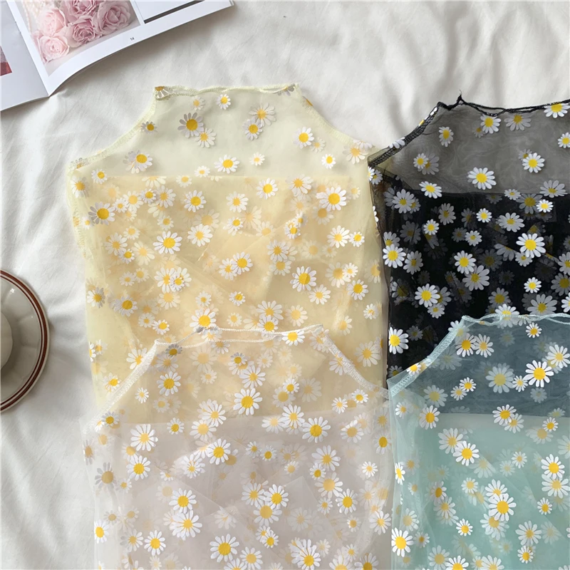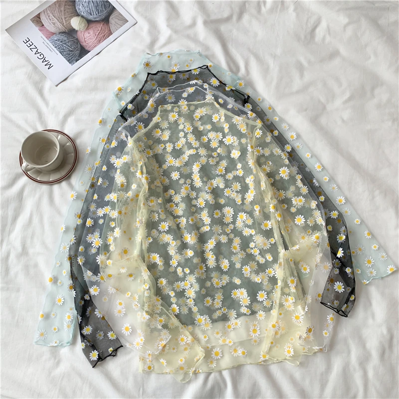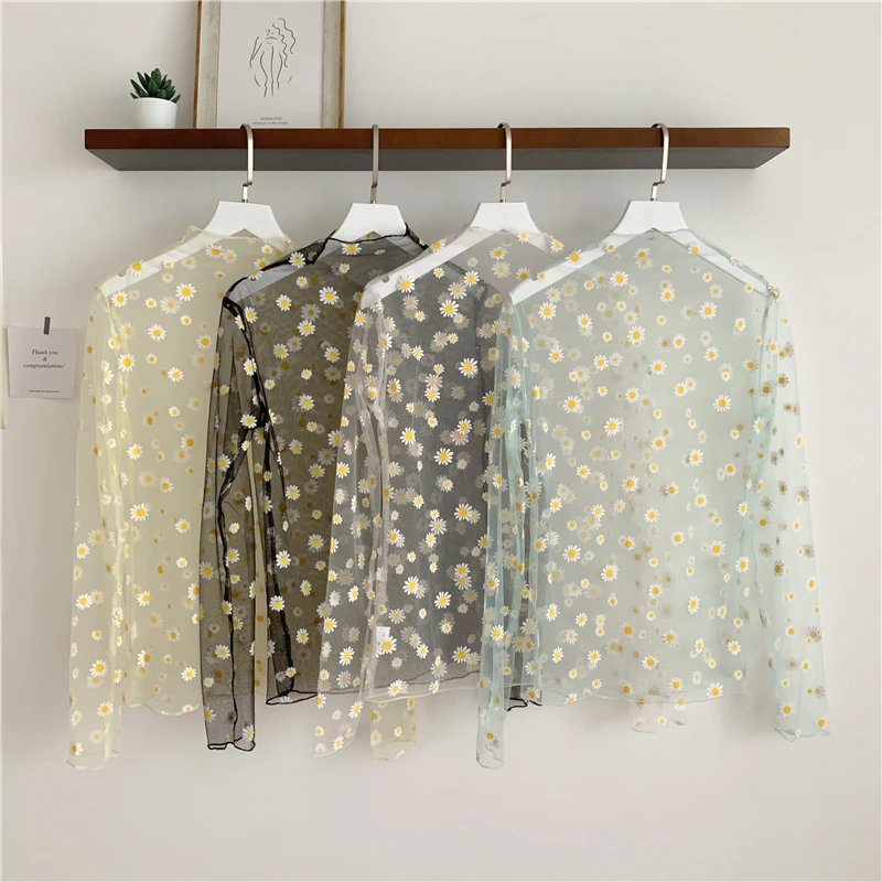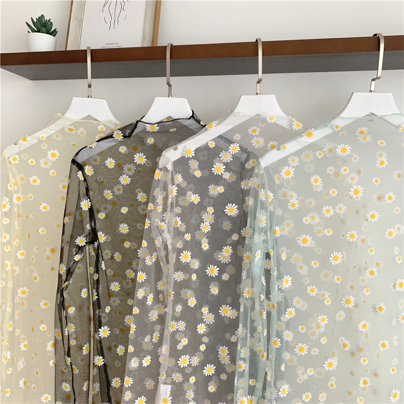 Summer Autumn Women Casual Mesh Pattern Daisy Flower Printed Blouse Tops Girls Mesh Shirts See Through Shirt For Female