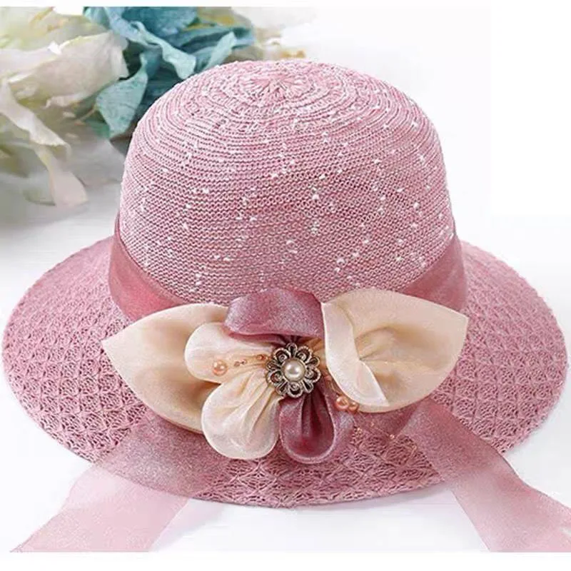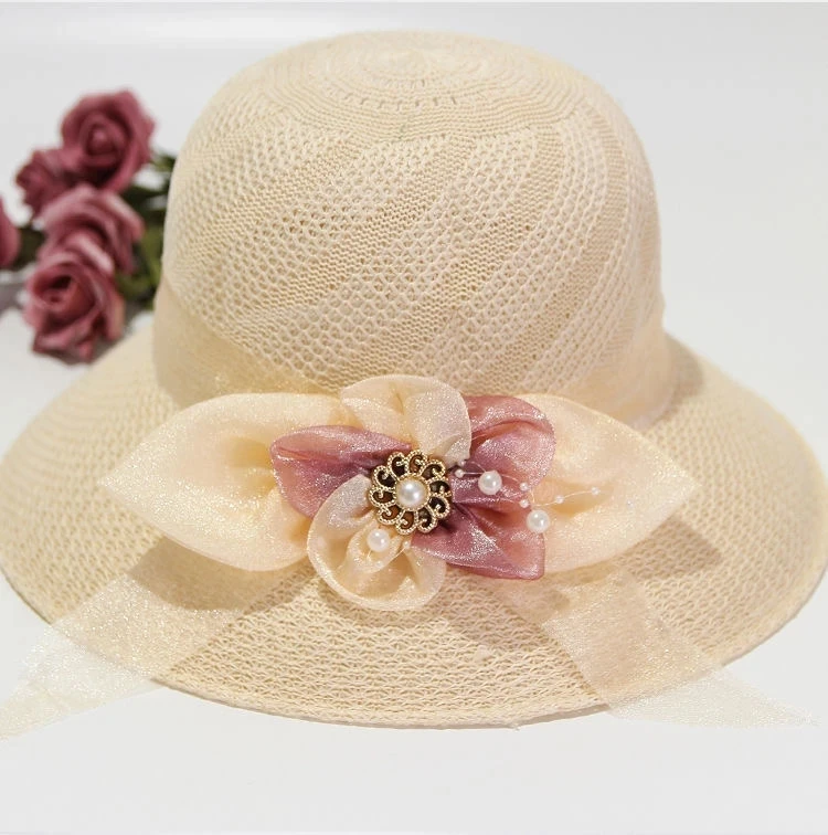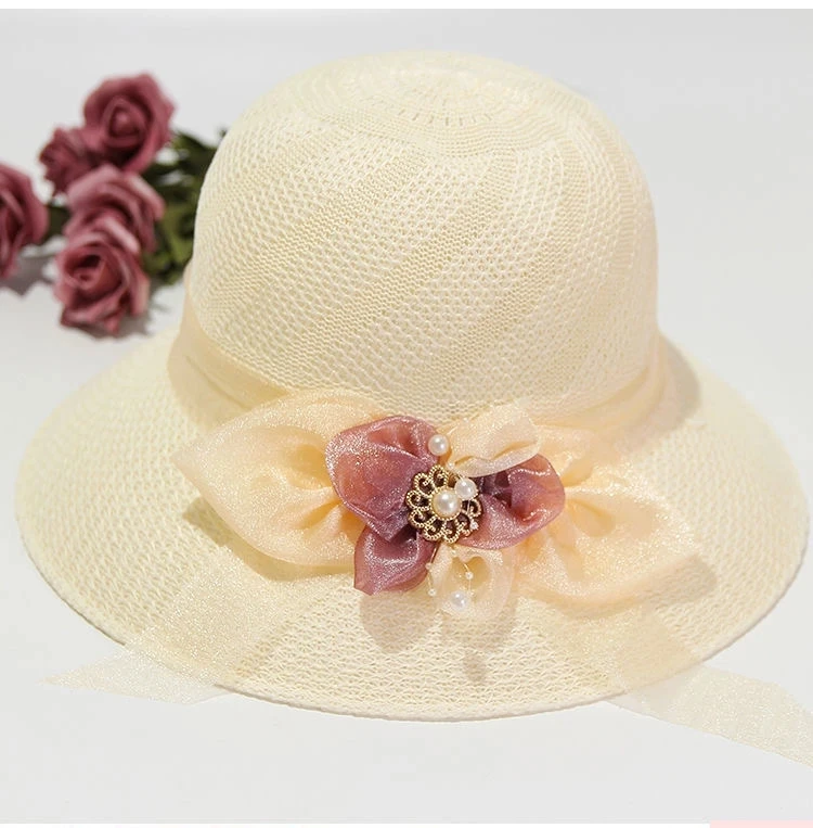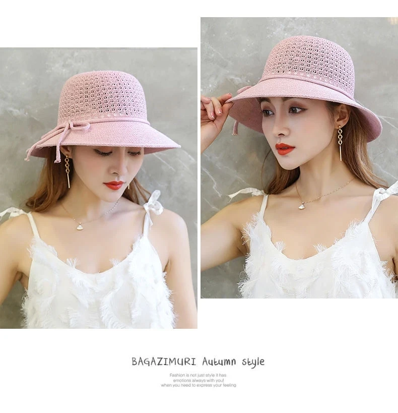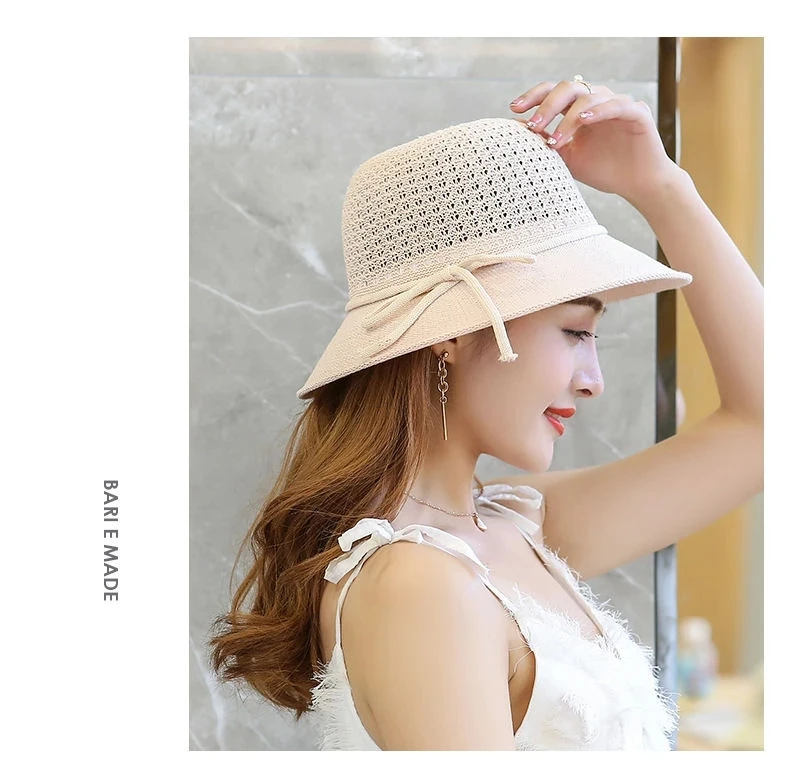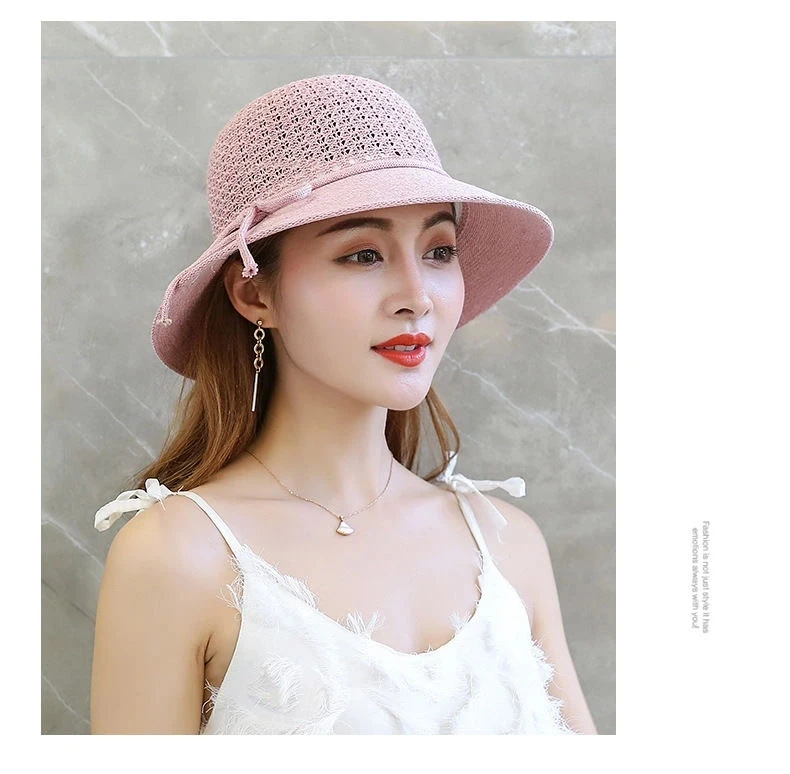 Summer Ladies Elegant Bucket Hat with Flower Women Leisure Beach Sun Hat Female Wide Brim Pink Beige Hollow Out Bucket Hat Cap