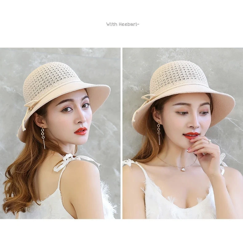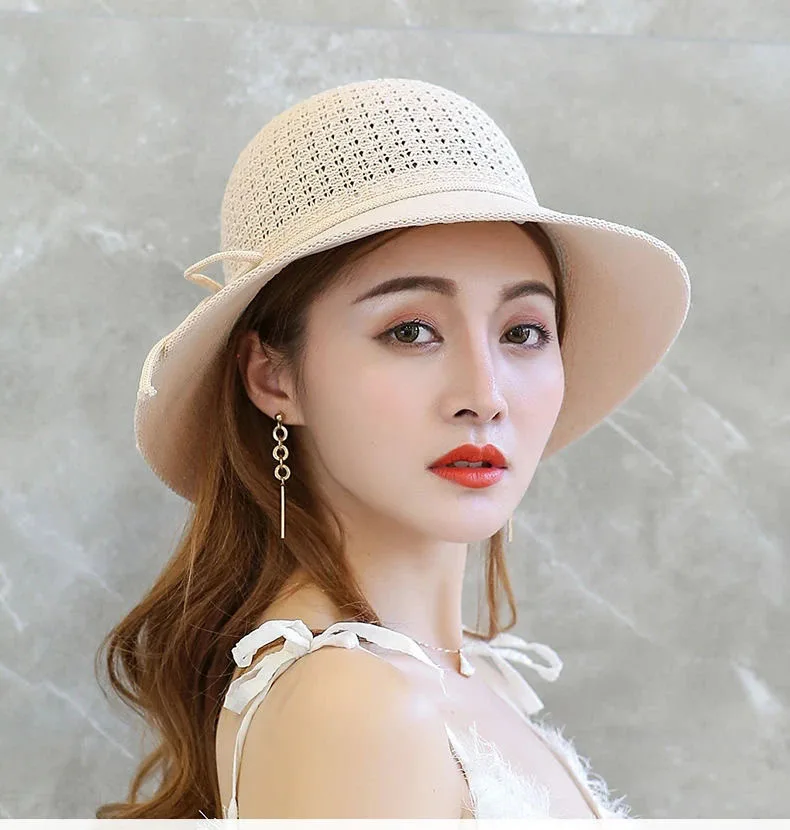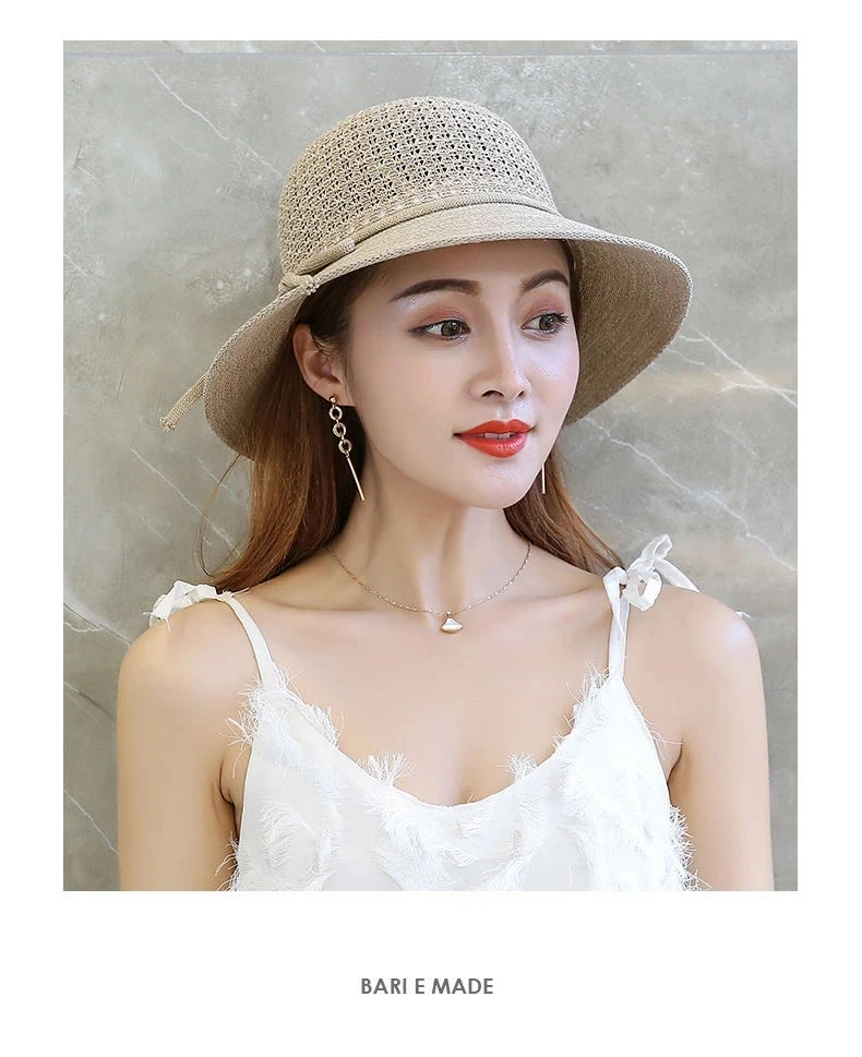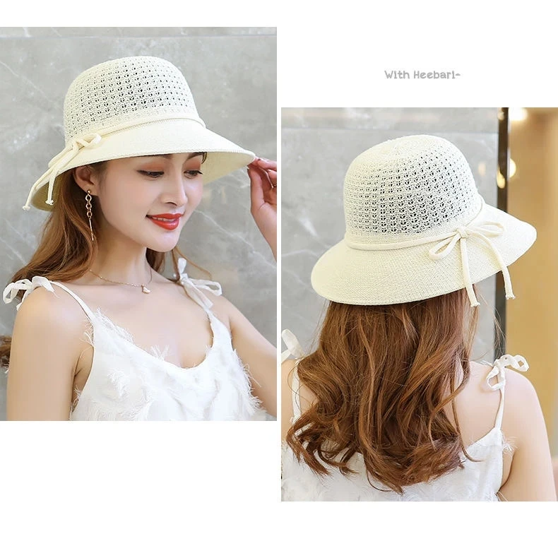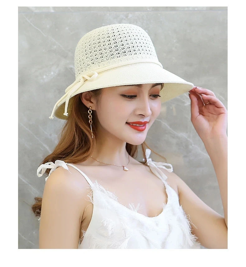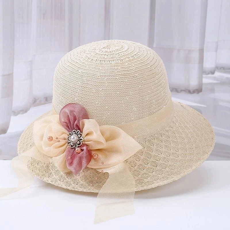 Summer Ladies Elegant Bucket Hat with Flower Women Leisure Beach Sun Hat Female Wide Brim Pink Beige Hollow Out Bucket Hat Cap